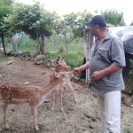 Primele animale sălbatice care au ajuns în curtea lui Ion Sorin Sofonea au fost cerbii lopătari. Aceştia au fost achiziţionaţi în urmă cu patru ani de la o fermă din Germania. O pereche l-a costat 1.000 de euro. ,,De aceste animale m-am îndrăgostit în Austria, acolo am văzut multe ferme cu cerbi lopătari şi mi-au plăcut. Cerbii lopătari sunt foarte cuminţi, blânzi şi foarte frumoşi. Masculul se deosebeşte de femelă fiind mai mare. Corpul unui mascul poate măsura în lungime 1,30 – 1,50 metri, iar culoarea este brun roşcată cu pete albe pe spinare. Cerbii lopătari trăiesc între 15 şi 18 ani în libertate, iar în captivitate între 20 şi 25 ani. Cerbii noştri s-au obişnuit cu turiştii şi nu se sperie, stau la mângâiat şi aşteaptă să primească ceva bun. În sezonul rece, cerbul a reuşit să iasă din curte şi l-am pierdut pentru câteva zile. Am fost surprins să văd mai multe postări pe reţelele de socializare cu cerbul meu. Aşa am reuşit să-l recuperez şi l-am adus acasă’’ a mai spus Ion Sorin Sofonea. De Rusalii s-a născut micuţa Rozi, un pui de cerb lopotar. Mezinul familiei Sofonea, Sara, a fost cea care le-a dat vestea naşterii puiului de cerb. ,,Nu ştiam ce s-a întâmplat, Sara striga de bucurie, mai avem un pui de cerb. Numele a fost inspirat de ziua în care s-a născut, de Rusalii. Rozi este un exemplar foarte frumos şi este vedetă în grădina zoologică” a mai spus Ion Sorin Sofonea. În prezent, în minigrădina zoologică trăiesc trei femele şi un mascul.