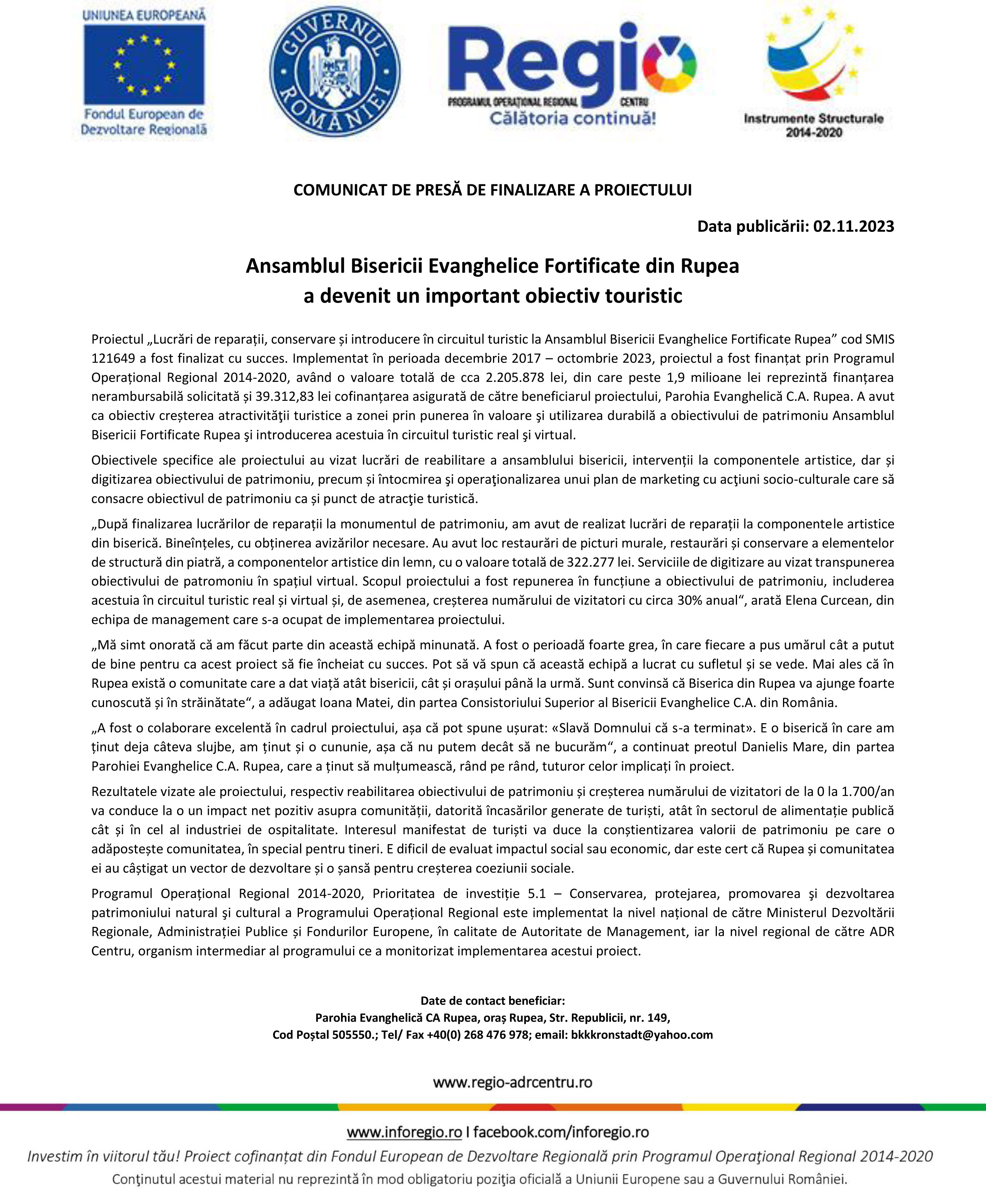 Proiectul „Lucrări de reparații, conservare și introducere în circuitul turistic la Ansamblul Bisericii Evanghelice Fortificate Rupea” cod SMIS 121649 a fost finalizat cu succes. Implementat în perioada decembrie 2017 – octombrie 2023, proiectul a fost finanțat prin Programul Operațional Regional 2014-2020, având o valoare totală de cca 2.205.878 lei, din care peste 1,9 milioane lei reprezintă finanțarea nerambursabilă solicitată și 39.312,83 lei cofinanțarea asigurată de către beneficiarul proiectului, Parohia Evanghelică C.A. Rupea. A avut ca obiectiv creșterea atractivităţii turistice a zonei prin punerea în valoare şi utilizarea durabilă a obiectivului de patrimoniu Ansamblul Bisericii Fortificate Rupea şi introducerea acestuia în circuitul turistic real şi virtual.
