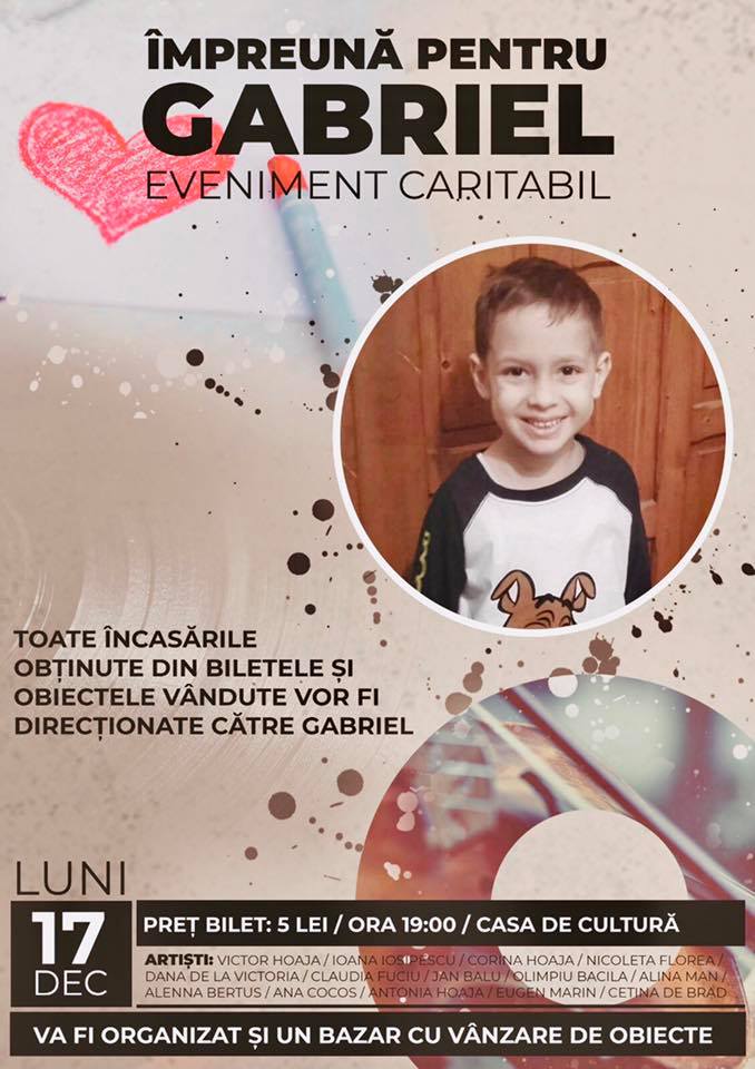 Spectacolul caritabil intitulat ,,Împreună pentru Gabriel”  a adunat 11.801 lei şi 100 euro. Spectacolul a fost organizat de Casa de Cultură Victoria şi un grup de mămici în 17 decembrie a.c., ora 19.00. Spectacolul a atras mulţi localnici dornici să se implice în campania caritabilă care-i poate salva viaţa micuţului Gabriel. Au urcat pe scenă artişti din Victoria şi elevi care au încîntat o sală arhiplină. În cadrul evenimentului au fost puşi în vînzare şi brazii confecţionaţi de copiii de la Clubul Copiilor Victoria, cercul ecoturism, dar şi ornamente de Crăciun şi prăjituri ce au fost realizate de  mămici. La finalul evenimentului, numărătoarea colectei a ajuns la 11.801 lei şi 100 euro, bani care au fost predaţi familiei Voicu.
