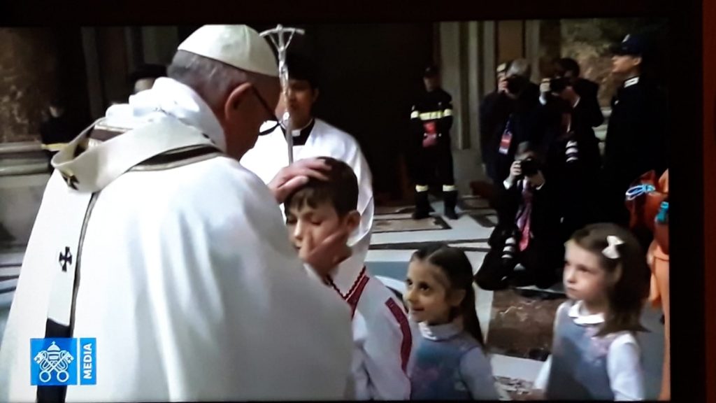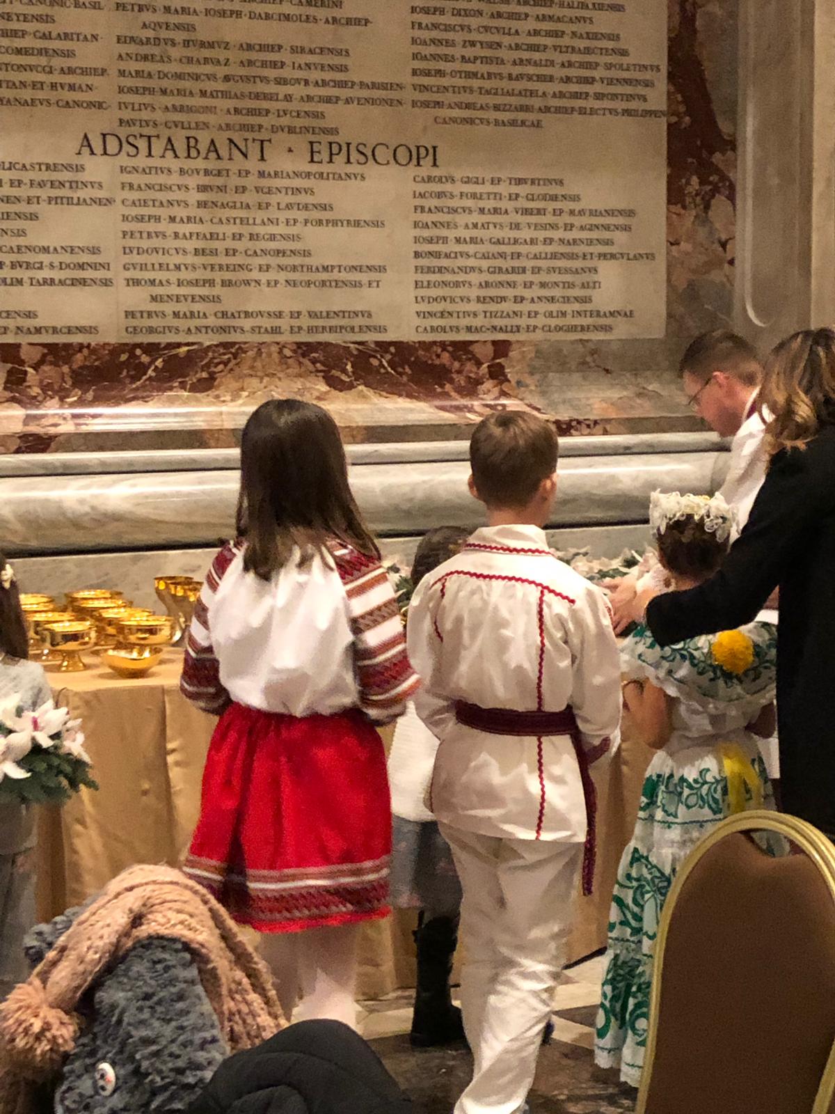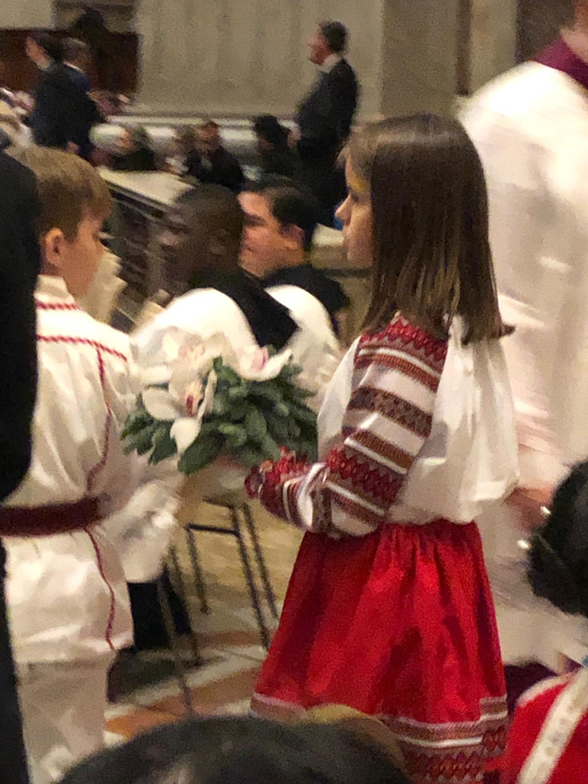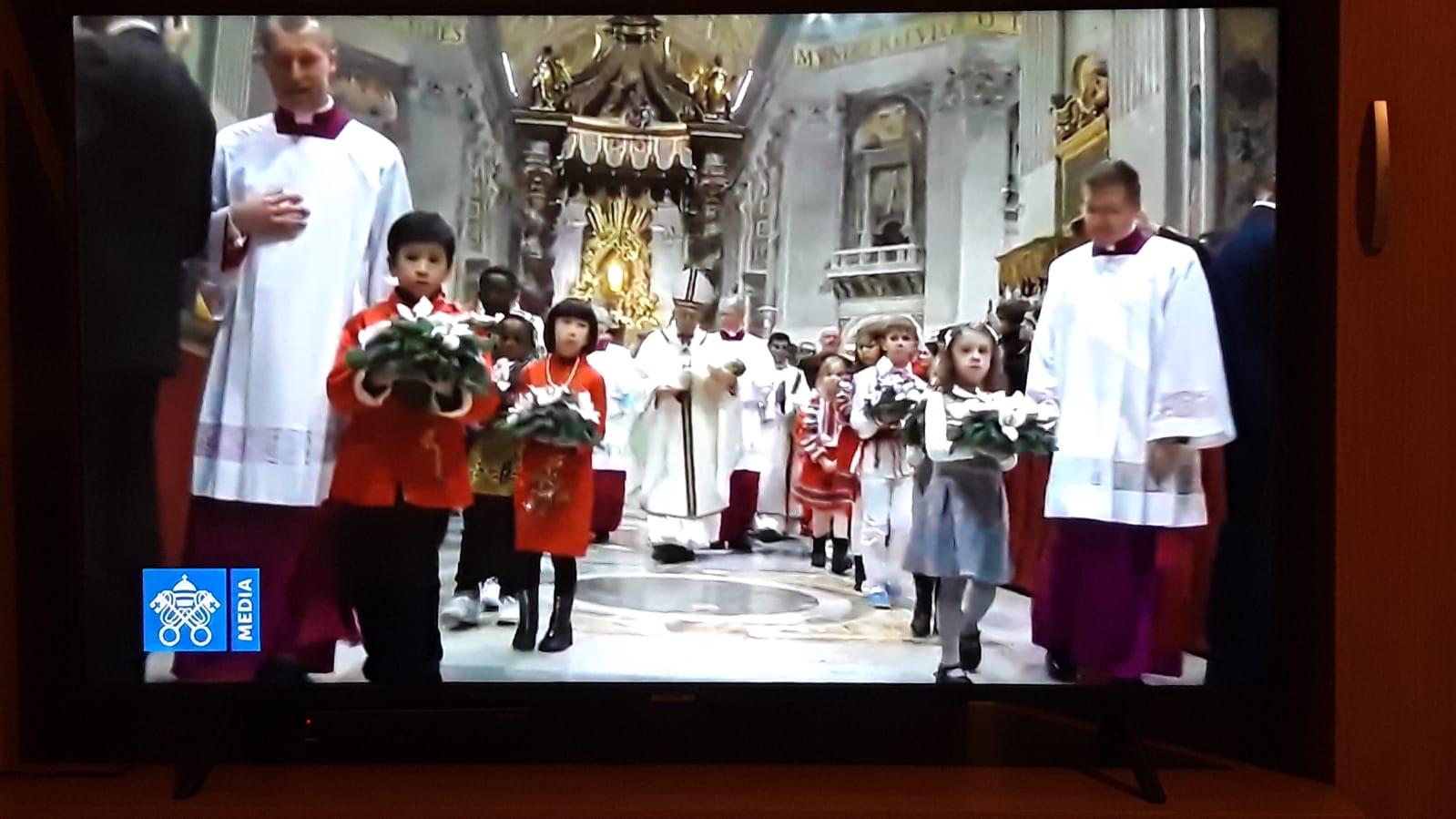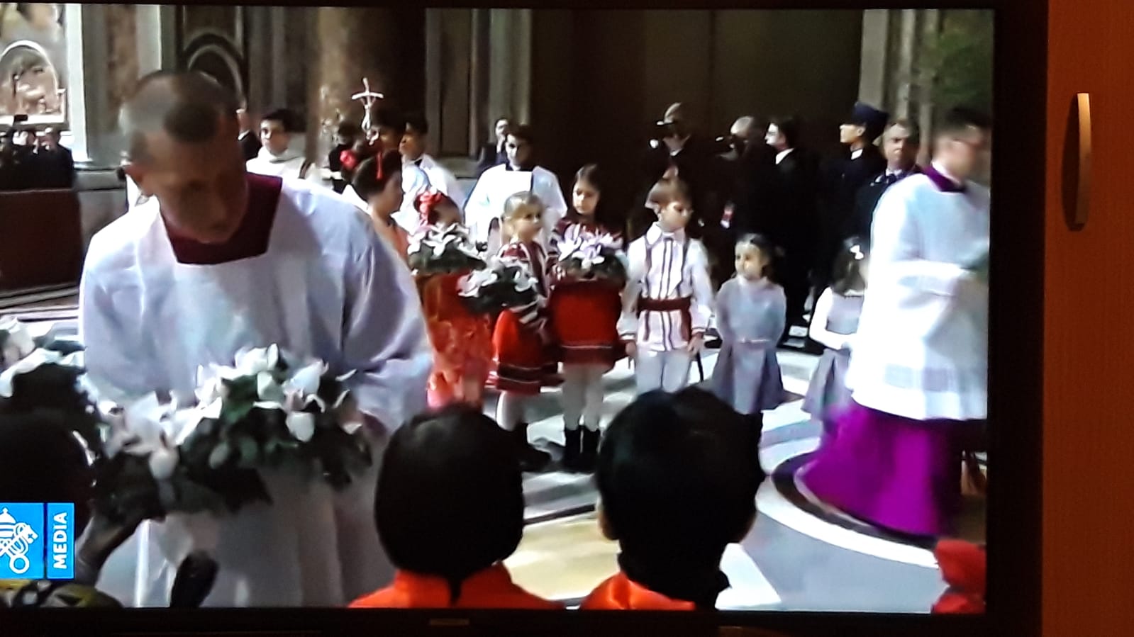 12 copii din şase ţări de pe mapamond au deschis procesiunea papală de la Vatican în Ajunul Naşterii Mântuitorului. Ei au păşit în faţa Suveranului Pontif care purta puncul spre ieslea montată în impresionantul altar din Basilica San Pietro, amintind astfel despre Naşterea pruncului în ieslea din Betleemul Iudeii în urmă cu 2000 de ani. Alaiul era format din 30 de cardinali şi 40 de episcopi. Procesiunea şi slujba au început la ora 21.30 în seara de 24 decembrie şi au durat o oră şi jumătate în basilica San Pietro. O fetiţă şi un băiat din România au făcut parte din grupul celor 12 copii aleşi pentru a fi binecuvîntaţi de Papa Francisc.