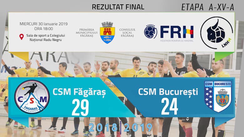 Campionatul Liga Zimbrilor s-a reluat cu etapa a– XV-a în care echipa CSM Făgăraş a întâlnit echipa CSM București, pe teren propriu. Meciul a avut loc în sala de sport de la CN ,,Radu Negru” miercuri, 30 ianuarie, începând cu ora 18.00. Emoţiile sportivilor , dar şi ale publicului au fost spulberate încă de la pauză cînd tabela de marcaj arăta scorul 17-12 în favoarea făgărăşenilor. La finalul partidei CSM Făgăraş s-a impus cu scorul 29-24. Echipa condusă de Adrian Petrea şi Eugen Frăţilă s-a impus astfel în faţa echipei d epe locul I din clasament.
