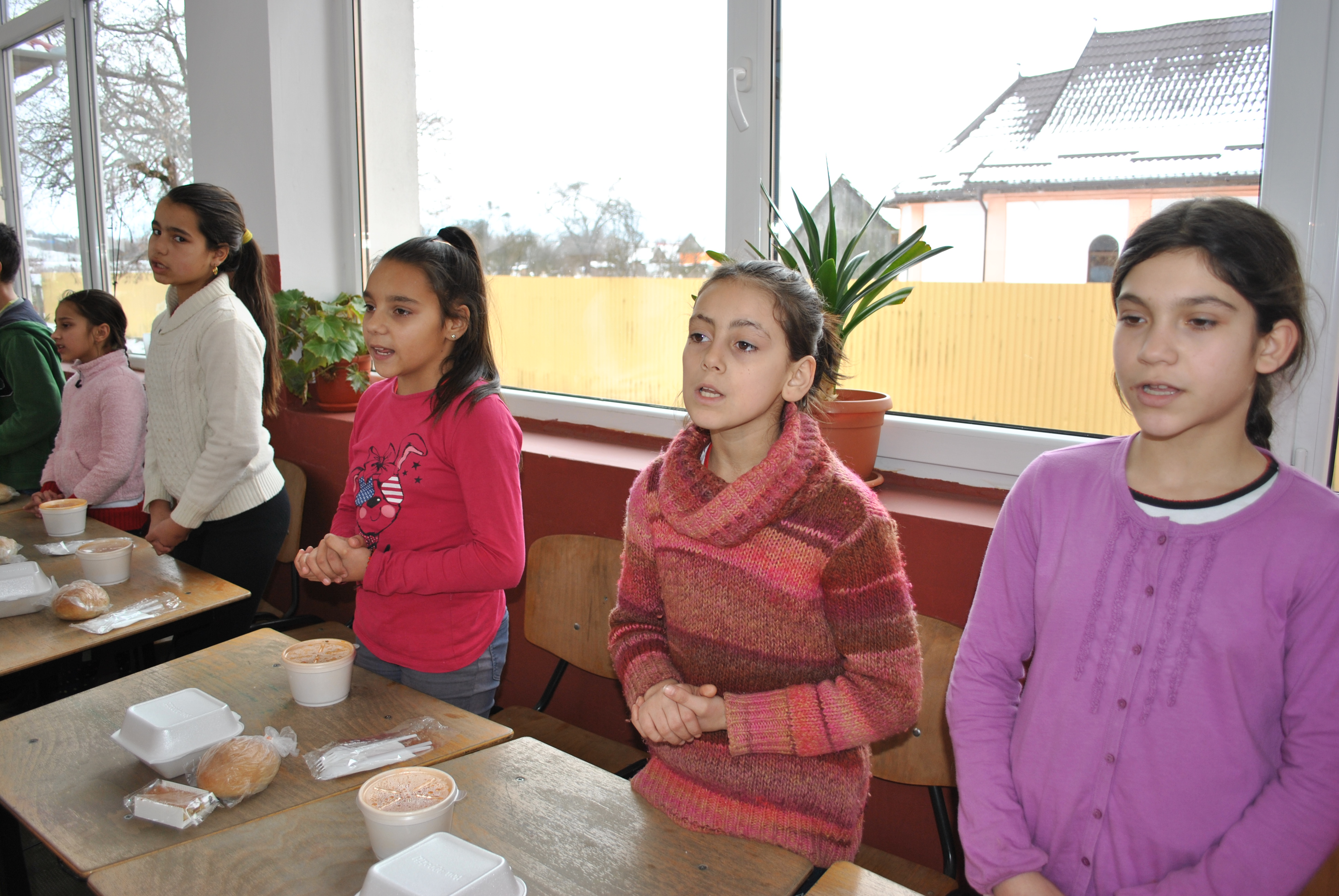 Am poposit şi la Şcoala din localitatea Cincşor unde funcţionează grădiniţa şi clasele I, III şi IV, cu un total de 57 de elevi. La ora 12.30 holul şcolii s-a transformat în sală de mese. În cîteva minute au fost aşezate măsuţele şi scăunelele pe hol, iar micuţii, după ce s-au spălat pe mîini, şi-au ocupat locurile în cea mai deplină linişte. Învăţătoarele şi educatoarea le-au aşezat caserolele cu mîncare în dreptul lor. Cînd totul a fost aranjat, copiii s-au ridicat în picioare şi laolaltă cu dăscălii au rostit cu voce tare rugăciunea ,,Tatăl Nostru”. A fost un moment solemn, care se repetă în fiecare zi, înainte de masă. Le luceau ochişorii micuţilor privind spre caserolele acoperite. Meniul zilnic este afişat, iar copiii s-au obişnuit déjà cu alimentele. ,,La început au refuzat unele feluri de mîncare pentru că nu le cunoşteau. Mîncau atunci cînd erau cartofi, ou şi ciorbă de legume. Supa cu tăiţei sau găluşti o refuzau. Acum s-au obişnuit şi mănîncă tot” au spus învăţătoarele. La Cincşor copiii nu dorm. Nici la celelalte şcoli din comună copiii nu dorm, doar primesc masa caldă zilnic.