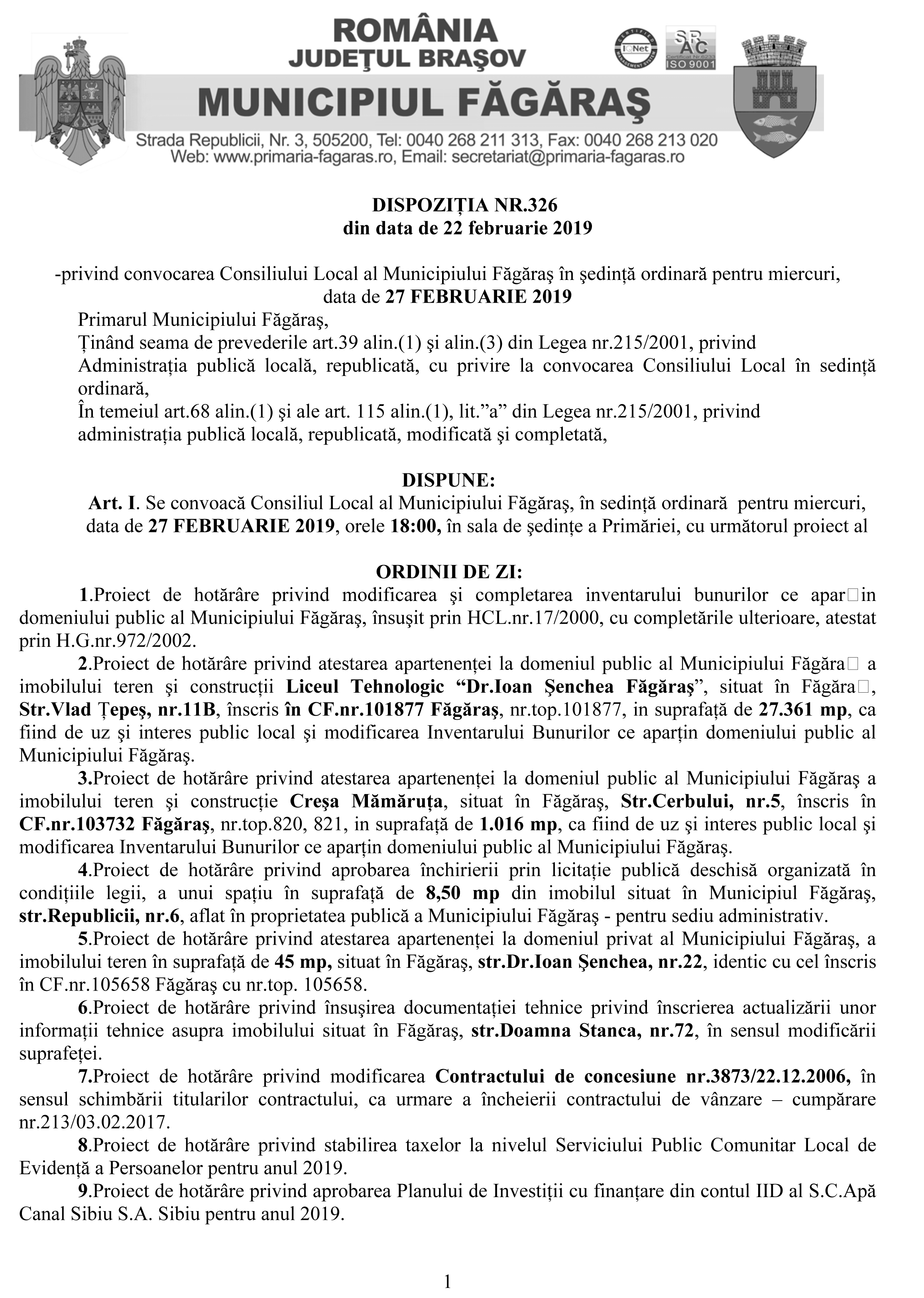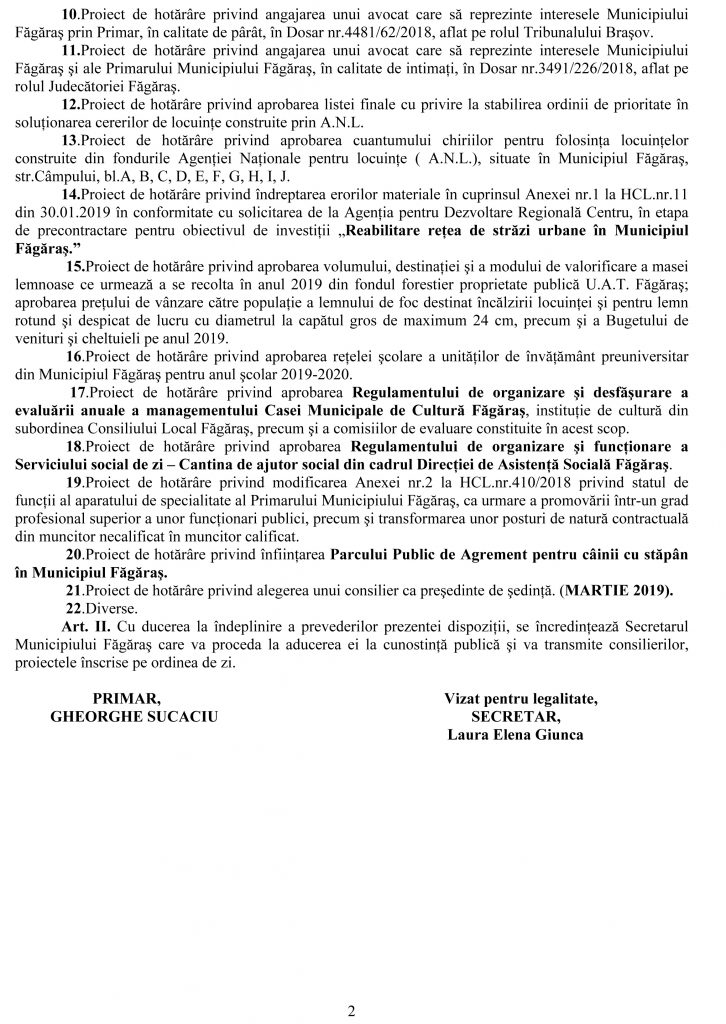 Dispoziţie primar Municipiul Făgăraş: şedinţă Ordinară a CL Făgăraş