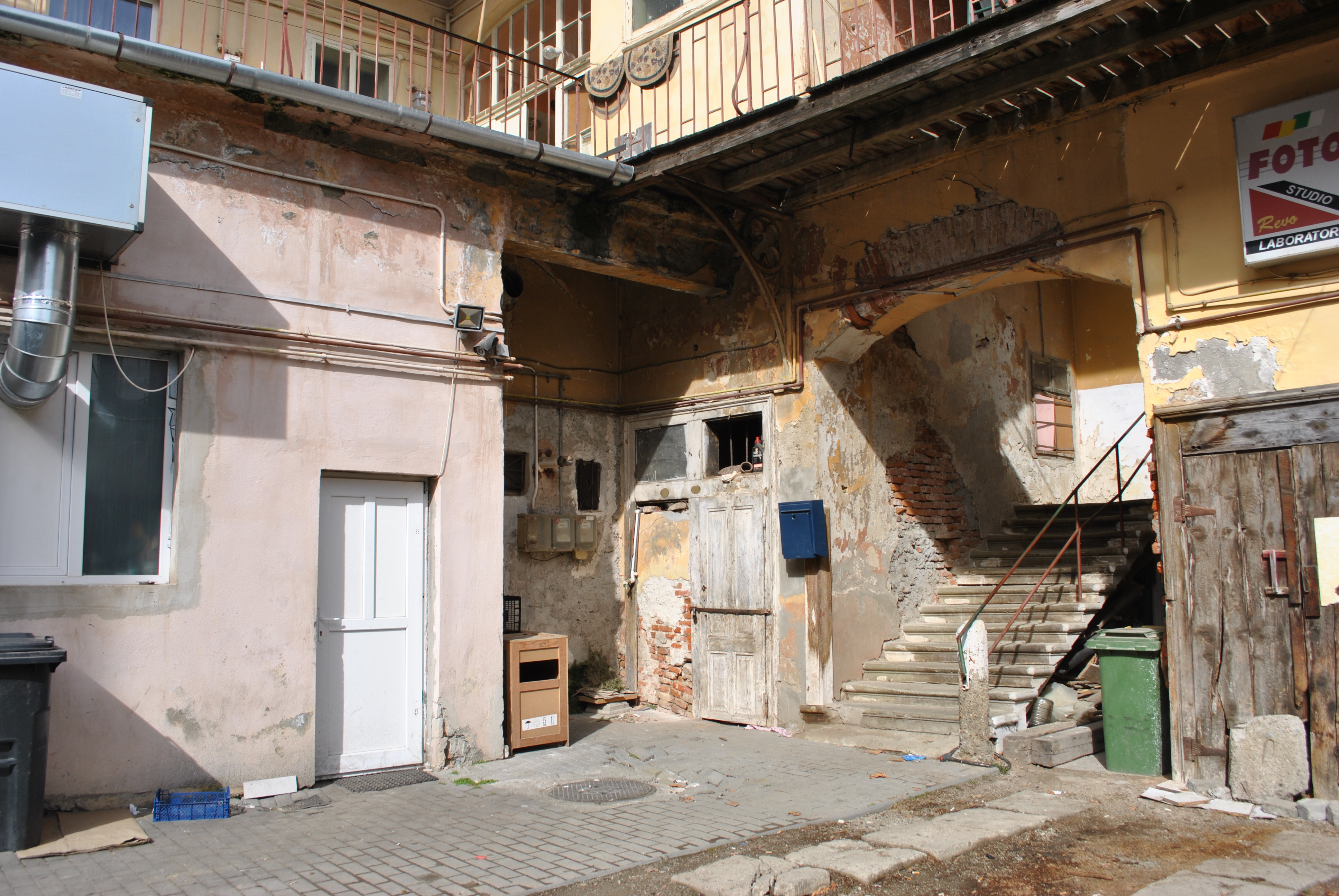 Când păşeşti în curtea de la numărul 21 din Piaţa Republicii ai impresia că aici locuiesc nişte oameni gospodari. O curte măturată şi îngrijită la prima vedere. Dar după ce înaintezi descoperi un adevărat ghetou. La parter sunt două familii care nu au apă, nu au gaz metan, nu au canalizare ci doar curent electric.  Nu mai au nici contracte de chirie pentru că proprietarul, un cetăţean din Austria, spun ei, nu a vrut să le prelungească chiriile. Folosesc în comun un wc turcesc, insalubru. Chiar în spatele curţii imobilului  este trasat un gard de lemn care ascunde o mizerie de nedescris.  Deşeuri de tot felul, fecale, saci cu gunoaie, toate ocupă întreaga curte împrejmuită. Căsuţa este într-o stare de degradare avansată, aproape de prăbuşire, iar iarna este un bun adăpost pentru boschetari  Chiriaşii de aici se plâng oricui îi ascultă şi depun, aşa cum spun ei, cereri la Primăria Făgăraş pentru a obţine locuinţe în alte imobile.  Urcând la etaj, lucrurile par şi mai grave.  O singură porţiune din acest nivel este reabilitată, făgărăşeanul care o locuieşte reuşind să devină proprietar după ce a locuit aici din anul 1960. În rest, etajul este în paragină. În urmă cu un an, tavanul unei părţi  din acest etaj al clădirii s-a prăbuşit. Şi acum molozul este neridicat, iar acoperişul în pericol să se prăbuşească.  Dumitru Ciocan de 80 de ani  se teme că  locuinţa  sa va fi afectată dacă  partea de imobil vecină cu proprietatea lui se va prăbuşi.  Clădirea a aparţinut lui Lauritsch Iuliu, un făgărăşean  originar din Viena, aşa cum ne explică notarul Mariana Săbăduş. Acesta a deţinut şi imobilul unde a funcţionat  cinematograful  Negoiu. Urmaşii vienezului au  primit clădirea în proprietate prin retrocedare.  Această curte de la nr. 21 a fost una dintre cele mai populate din centrul urbei, aici funcţionând atelierele  fotografilor renumiţi ai Făgăraşului, dar şi cinematograful, ieşirea din sala de cinema fiind pe latura vestică a curţii.
