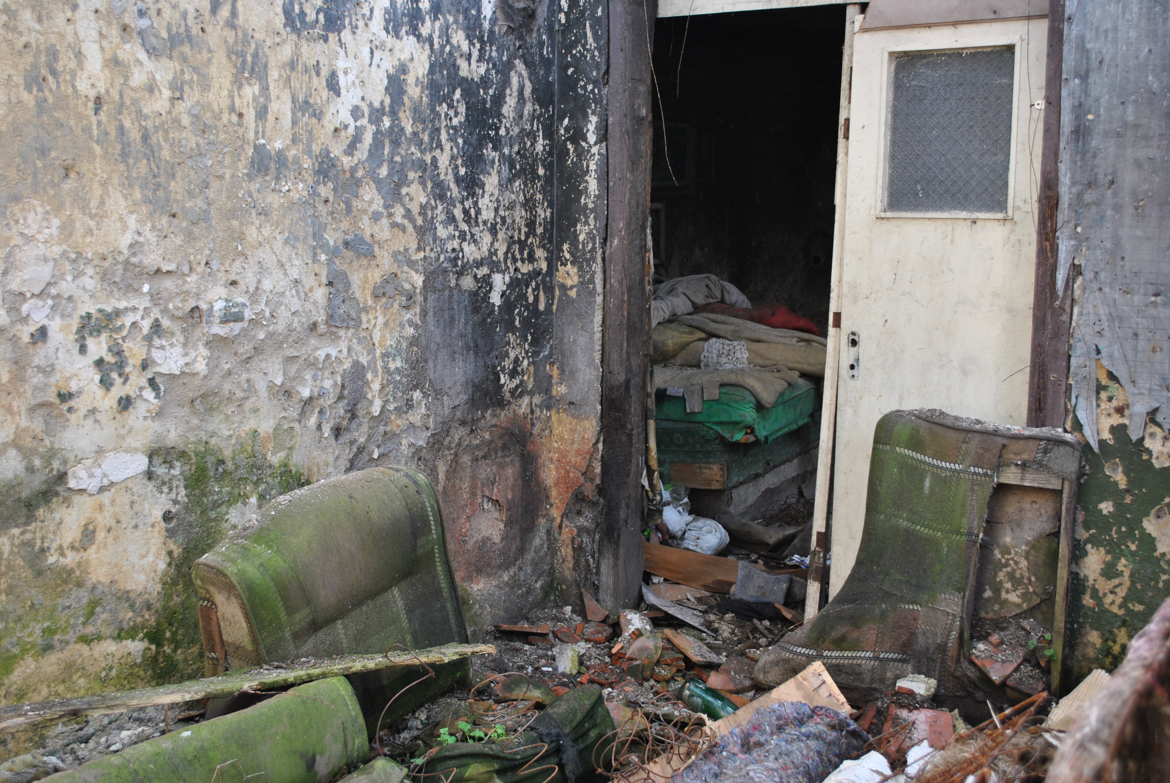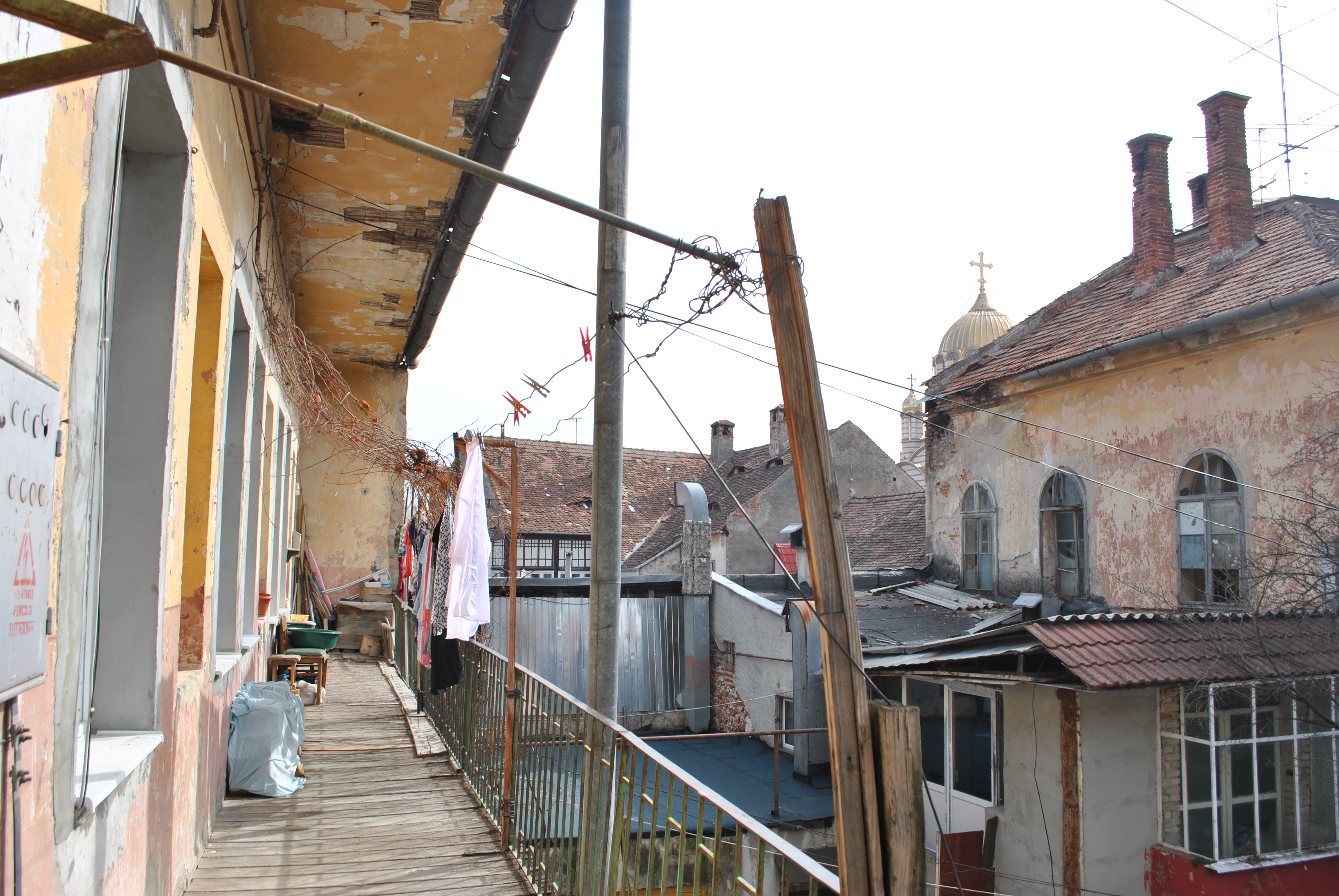 La câţiva metri mai încolo o altă clădire  completează imaginea ghetoului din centrul municipiului.  În perioada interbelică a fost cel mai frumos şi căutat complex al Făgăraşului şi era format din restaurantul şi hotelul Mercur. Ulterior  parterul a găzduit  magazine şi o bancă. Astăzi nu mai este ce a fost, curtea este în paragină.  Este administrată de Primăria Făgăraş care percepe chirii de la locatari.  La parterul clădirii funcţionează două cluburi şi trei ateliere,unul foto, unul  de bobinaj şi altul de cosmetică. La etaj sunt 11 familii, unele moştenind statutul de chiriaşi de la părinţi sau bunici.   Aceste familii trăiesc un pericol zi de zi pentru că imobilul este într-o stare avansată de degradare. Acoperişul este deteriorat, pe alocuri existând pericolul de prăbuşire. Balcoanele exterioare pe care locatarii le folosesc pentru a ajunge la locuinţe nu mai prezintă siguranţă, podelele lor din scândură fiind rupte. Tencuiala clădirii este căzută până la cărămidă, iar tavanele stau să se prăbuşească. Scara ce duce la podul imobilului este grav deteriorată. O parte a etajului nu este locuită şi este avariată. Chiriaşii, prin vocea lui Ciprian Medrea, se plâng de ani de zile, dar nimeni nu le-a rezolvat problemele. ,,Stăm cu frică aici pentru că la parter funcţionează două cluburi care nu au fost autorizate ISU.  Dacă ia foc ceva, ardem toţi ca şobolanii. Nu s-au făcut reparaţii la acest imobil de ani de zile deşi noi am solicitat Primăriei. În plus, au fost construite fără autorizaţii cîteva anexe” a spus Medrea.   Proiecte de reabilitare a centrului Făgăraşului au existat prin sertarele Primăriei Făgăraş, dar niciunul nu a fost implementat.  Va urma (Lucia BAKI, Carla TATU)