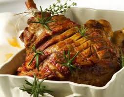 Carnea se spală cu apă rece şi se împănează cu usturoi şi cu bacon. Din sare, piper, cimbrişor şi boia se face un mix de condimente cu care se masează bine carnea pe toate părţile. Legumele se curăţă, se spală şi se taie rondele. Într-o tavă se aşază carnea împreună cu legumele. Peste acestea se adaugă ulei şi 100 ml de apă după care tava se acoperă cu folie de aluminiu şi se dă la cuptor timp de două ore la 140 grade C. Din cînd în cînd se mai ridică folia şi friptura se stropeşte cu lichiduljiul din tavă. Cînd friptura este aproape gata se dă jos folia de aluminiu şi se lasă să se rumenească.