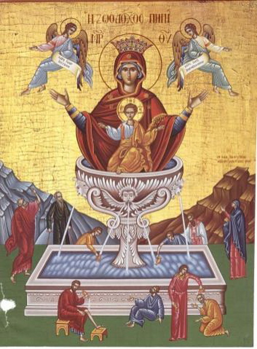 De acest praznic se sfinţeşte apa, cunoscută şi sub numele de Aghiasma Mică. În icoana sărbătorii Izvorul Tămăduirii, Maica Domnului şi Hristos se află într-un bazin asemănător cu o cristelniţă, vasul în care primim Taina Botezului. Fecioara Maria este reprezentată cu mîinile înălţate, semn al rugăciunii, iar Mântuitorul binecuvântând cu ambele mâini, ca răspuns al rugăciunilor maicii Sale. Din bazin izvorăşte apa care are darul tămăduirii bolilor sufleteşti şi trupeşti. Această icoană exprimă ideea că Fecioara L-a născut pe Hristos, Care este Dătătorul apei vii a Duhului. De altfel, însuşi Hristos i-a spus femeii samarinence: „De ai fi ştiut darul lui Dumnezeu şi cine este Cel ce zice ţie: dă-mi să beau, tu ai fi cerut de la Dânsul şi ţi-ar fi dat ţie apa vie“ (În. 4, 10; În. 7, 38).