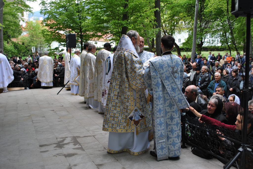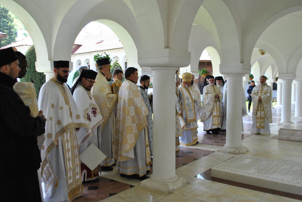 La sfârşitul maslului, enoriaşii au fost miruiţi de preoţi şi au luat anafură. Alaiul de preoţi a părăsit apoi altarul în procesiune până în curtea mănăstirii pe un culoar format de jandarmi prin mulţime. Au poposit la mormintele din curtea ediciciului unde au săvârşit o slujbă de pomenire pentru mitropoliţii ce-şi au odihna veşnică aici. A urmat masa în trapeza mănăstirii.