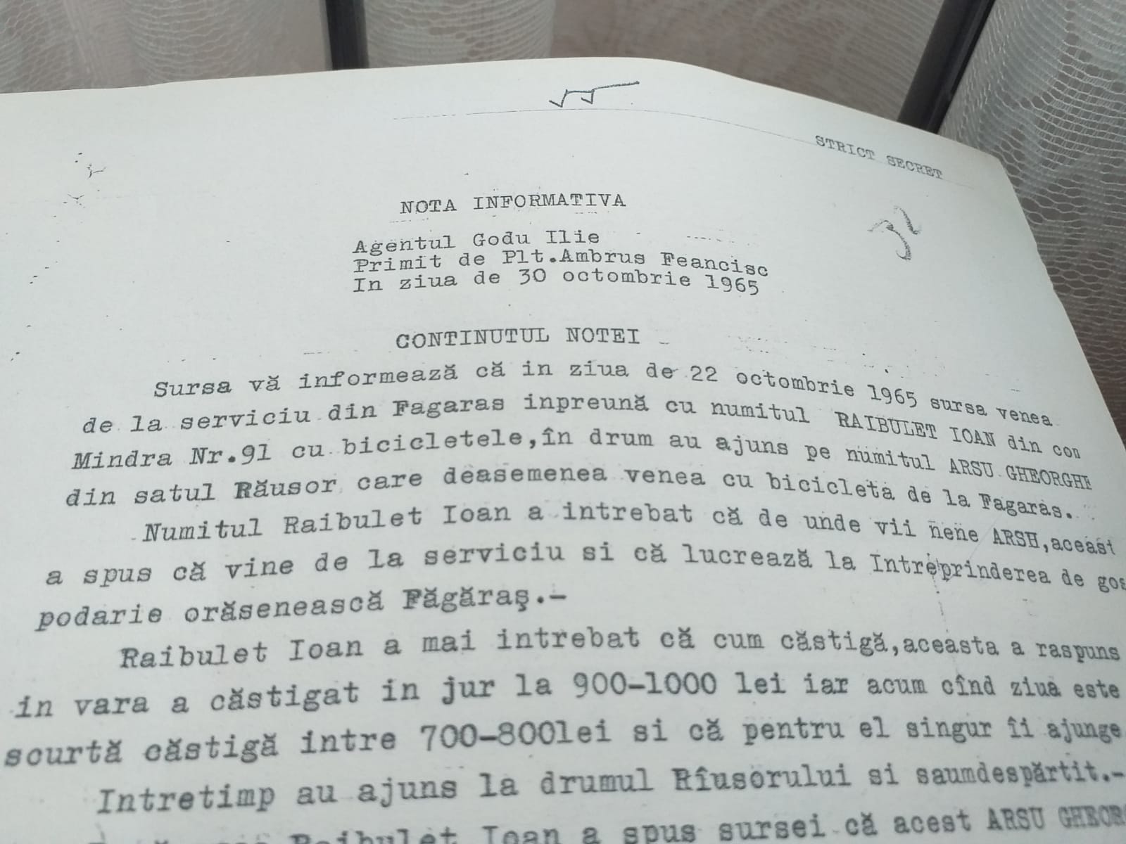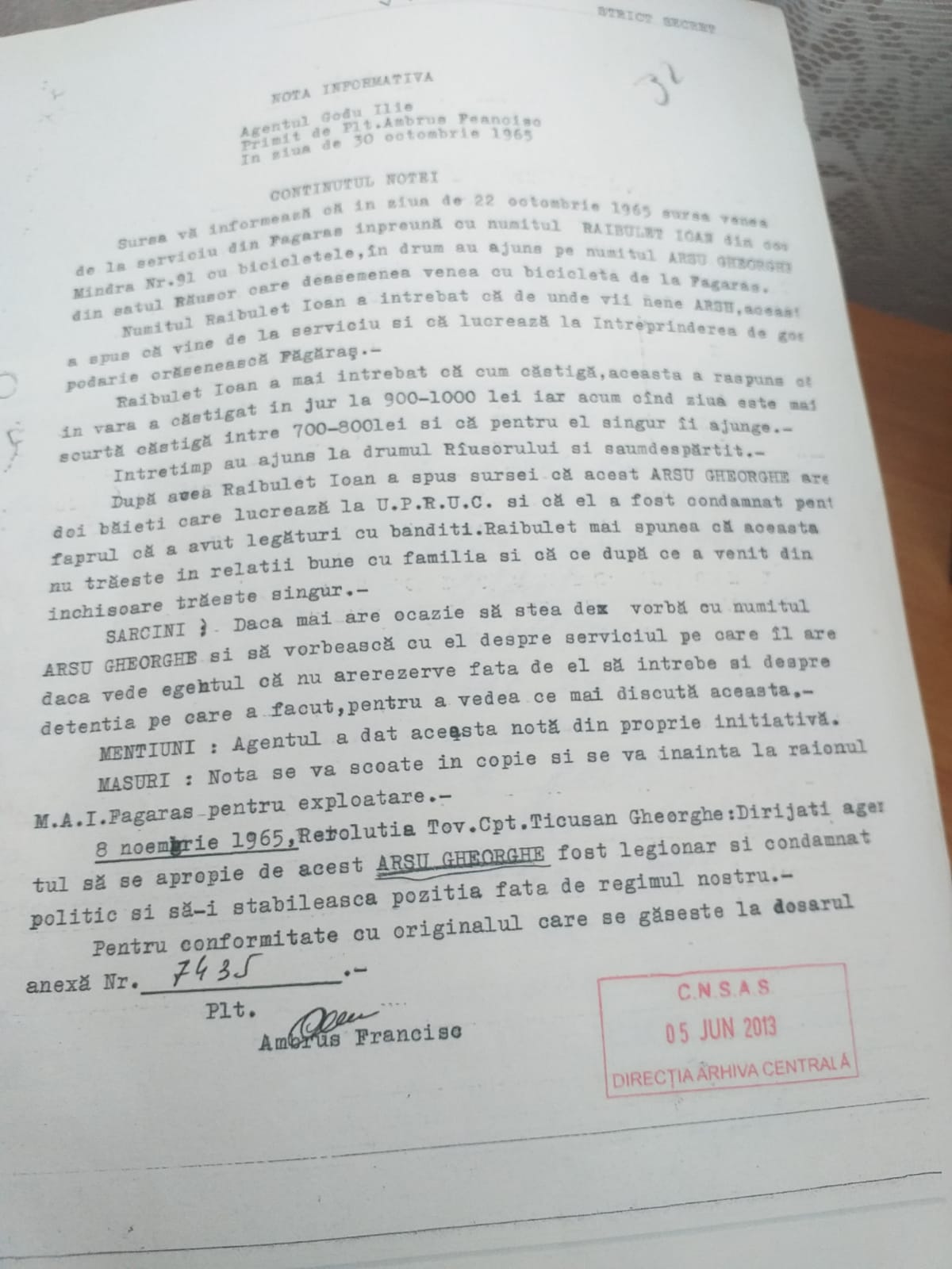Sursa vă informează că în ziua de 22 octombrie 1965 sursa venea de la serviciu din Făgăraş împreună cu numitul Răibuleţ Ioan din comuna Mândra, nr. 91 cu bicicletele, în drum au ajuns pe numitul Arsu Gheorghe din satul Râuşor care, de asemenea, venea cu bicicleta de la Făgăraş. Numitul Răibuleţ Ioan a întrebat că ,,de unde vii nene Arsu“, acelaşi a spus că vine de la serviciu şi că lucrează la Întreprinderea de gospodărie orăşenească Făgăraş. Răibuleţ Ioan a mai întrebat că cum câştigă, acesta a răspuns că în vară a câştigat în jur la 900-1000 lei iar acum, când ziua este mai scurtă, câştigă între 700-800 lei şi că pentru el singur îi ajunge. Între timp au ajuns la drumul Râuşorului şi s-au despărţit. După aceea Răibuleţ Ioan a spus sursei că acest Arsu Gheorghe are doi băieţi care lucrează la U.P.R.U.C. şi că el a fost condamnat pentru faptul că a avut legături cu bandiţii. Răibuleţ mai spunea că acesta nu trăieşte în relaţii bune cu familia şi că după ce a venit din închisoare trăieşte singur.