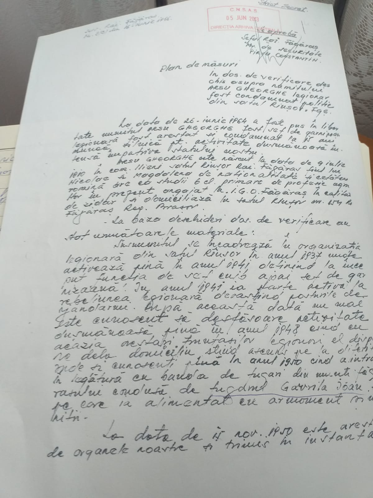 În dos. De verificare deschis asupra numitului Arsu Gheorghe, legionar, fost condamnat politic din satul Râuşor, Fgs.
