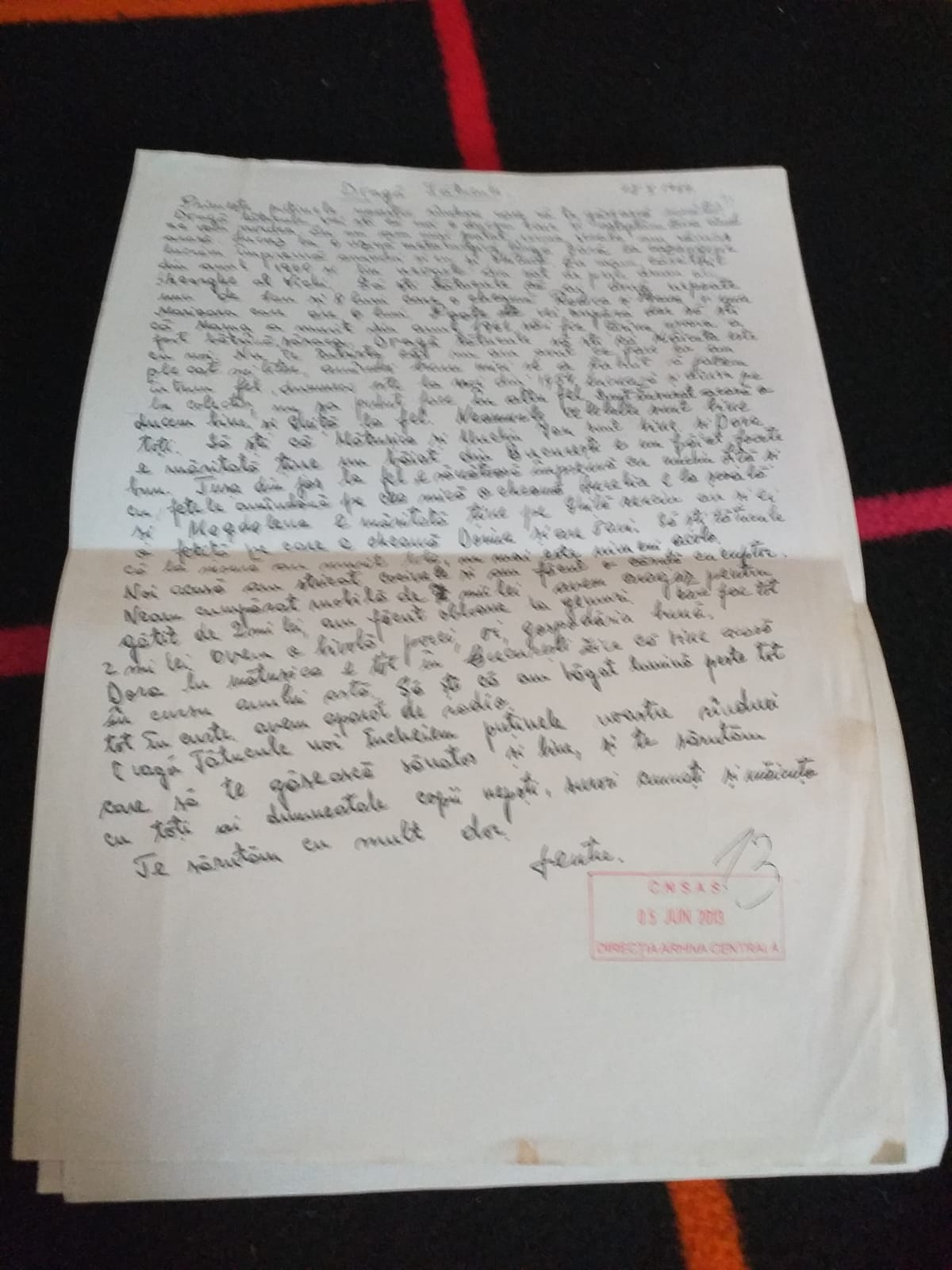 Laurenţiu Arsu, cel de-al doilea fiu al lui Gheorghe Arsu, a îndrăznit să-i scrie tatălui său o scrisoare, după ani în care n-a mai ştiut nimic de el. Această scrisoare s-a regăsit în arhiva C.N.S.A.S. Claudia a reuşit să intre în posesia scrisorii abia în data de 5 iunie 2013. Este un răvaş scris în dulcele grai făgărăşean, trimisă parcă nu în ,,iadul bolşevic“, ci într-o staţiune.