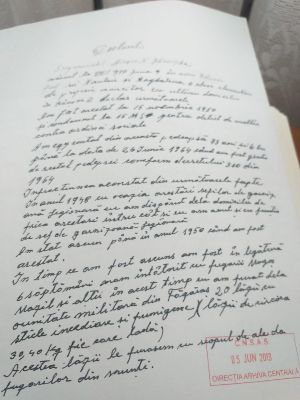 ,,Subsemnatul Arsu Gheorghe, născut la VII 910, ziua 9, în com. Râuşor, fiul lui Nicolae şi Magdalena, 6 clase elementare, de profesie muncitor cu ultimul domiciliu în Râuşor 2 declar următoarele: Am fost arestat la 15 noiembrie 1950 şi condamnat la 15 MS (N.R- muncă silnică) pentru delictul de uneltire contra ordinii sociale. Am executat din această pedeapsă 13 ani şi 6 luni până la data de 26 iunie 1964, când am fost graţiat de restul pedepsei conform decretului 310 din 1964. Infracţiunea a constat din următoarele fapte: În anul 1948, cu ocazia arestării şefilor de garnizoană legionară, eu am dispărut de la domiciliu de frica arestării întrucât şi eu am avut funcţia de şef de garnizoană legionară. Am stat ascuns până în anul 1950, când am fost arestat. În timp ce am fost ascuns, am fost în legătură 6 săptămâni, m-am întâlnit cu fugarii Mogoş Mazil şi alţii, în acest timp eu am furat de la unitatea militară din Făgăraş 20 lăzi cu sticle incendiare şi fumigene…Aceste lăzi le furasem cu scopul să le dau fugarilor din munţi“.