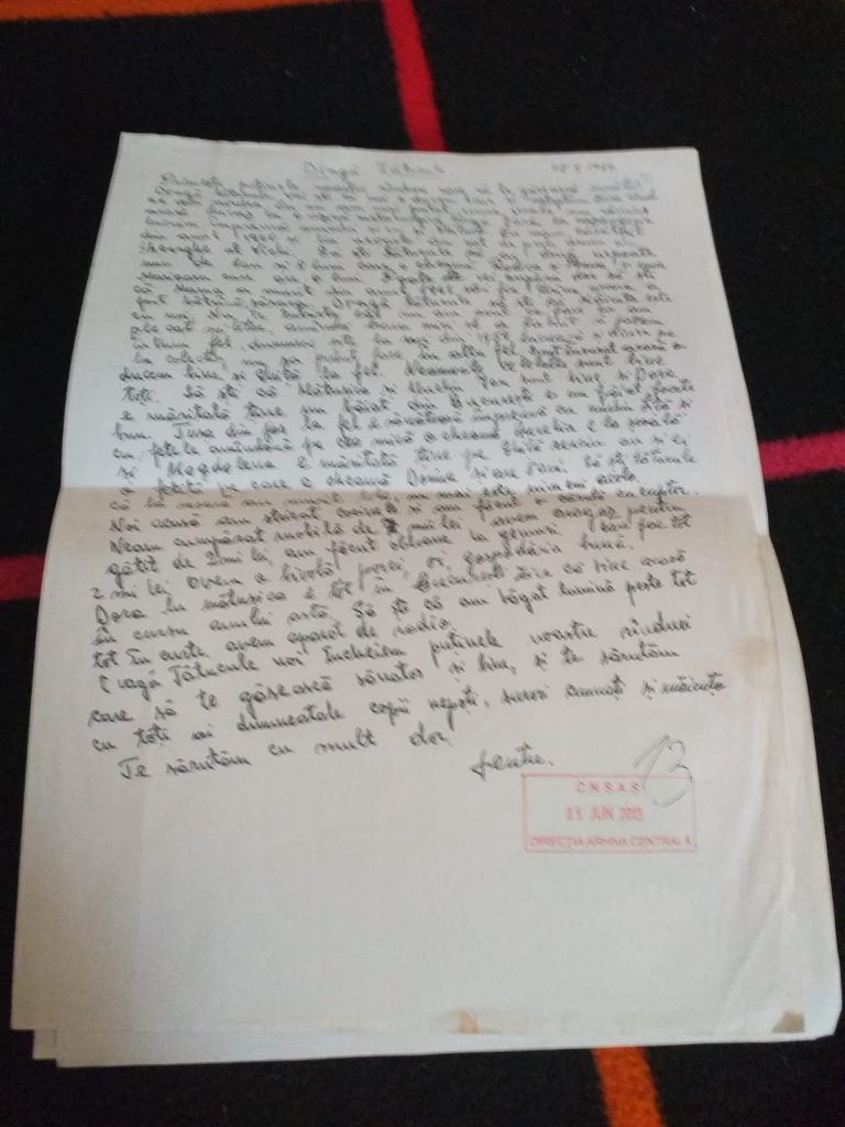Primeşte puţinele noastre rânduri care să te găsească sănătos. Dragă tătucule, vei şti că noi o ducem bine şi aşteptăm ziua când ne vom vedea. Eu nu am mai putut urma şcoala, am rămas acasă. Lucrez la o uzină metalurgică, lângă Gară, la cazangerie (N.R- probabil că este vorba de UPRUC), lucrăm împreună amândoi, eu şi Ghiţucă (N.R- Gheorghe Arsu, primul fiu al partizanului, tatăl Claudiei Arsu). Eu m-am căsătorit din anul 1960 şi ţin nevastă din sat, de peste drum, a lu Gheorghe al Vichi. Să ştii dragă tătucule că ai două nepoate, una de 1 an şi 8 luni, pe care o cheamă Rodica şi Ileana, şi una Mărioara, care are 6 luni. Poate te vei supăra, dar să ştii că Mama a murit din anul 1961, să-i fie ţărâna uşoară, a fost bătrână săraca. Dragă tătucule, să ştii că Măicuţa este cu noi. Nu te întrista, că nu am avut ce face, eu am plecat militar, amândoi eram mici şi a trebuit să facem într-un fel, dumneaei este la noi din 1954, lucrează şi dânsa pe la colectiv, nu s-a putut face în altu fel. Neamurile celelalte sunt bine toate. Sunt însurat, acasă o ducem bine, şi Ghiţă la fel. Neamurile celelalte sunt bine toţi. Să ştii că mătuşica şi unchiu Ion sunt bine, şi Dana e măritată, ţine un băiat din Bucureşti, e un băiat foarte bun. Tuşa din jos la fel, e sănătoasă împreună cu unchiu Liţă şi cu fetele amândouă, pe cea mică o cheamă Aurelia, e la şcoală, şi Magdalena e măritată, ţine pe Ghiţă Renciu, au şi ei o fetiţă pe care o cheamă Dorina şi are 5 ani. Să ştii tătucule că la moară au murit toţi, nu mai este nimeni acolo. Noi, acasă, am stricat cocinele şi am făcut o căsuţă cu cuptor. Ne-am cumpărat muzică de şapte mii lei, avem aragaz pentru gătit de 2 mii lei, am făcut obloane la geamuri care fac tot 2 mii lei. Avem o bivolă, porci, oi, gospodărie bună. Dora lu mătuşica e tot în Bucureşti, zice că vine acasă în cursu anului acesta. Să ştii că am băgat lumină peste tot, tot în curte avem aparat de radio. Dragă tătucule, noi încheiem puţinele noastre rânduri care să te găsească sănătos şi bine, şi te sărutăm cu toţii, ai dumneatale copii, nepoţi, surori, cumnaţi şi măicuţa. Te sărutăm cu mult dor, Lenţu“.
