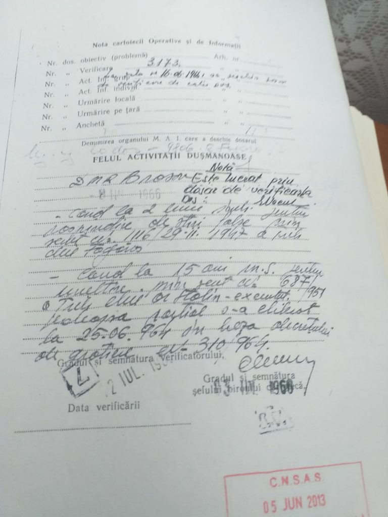 O notă informativă primită de plutonierul de securitate Francisc Ambrus în ziua de 30 octombrie 1965 de la agentul Ilie Godu, spune: