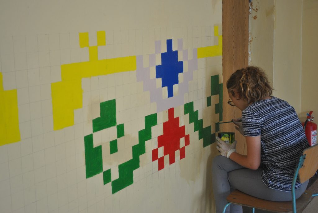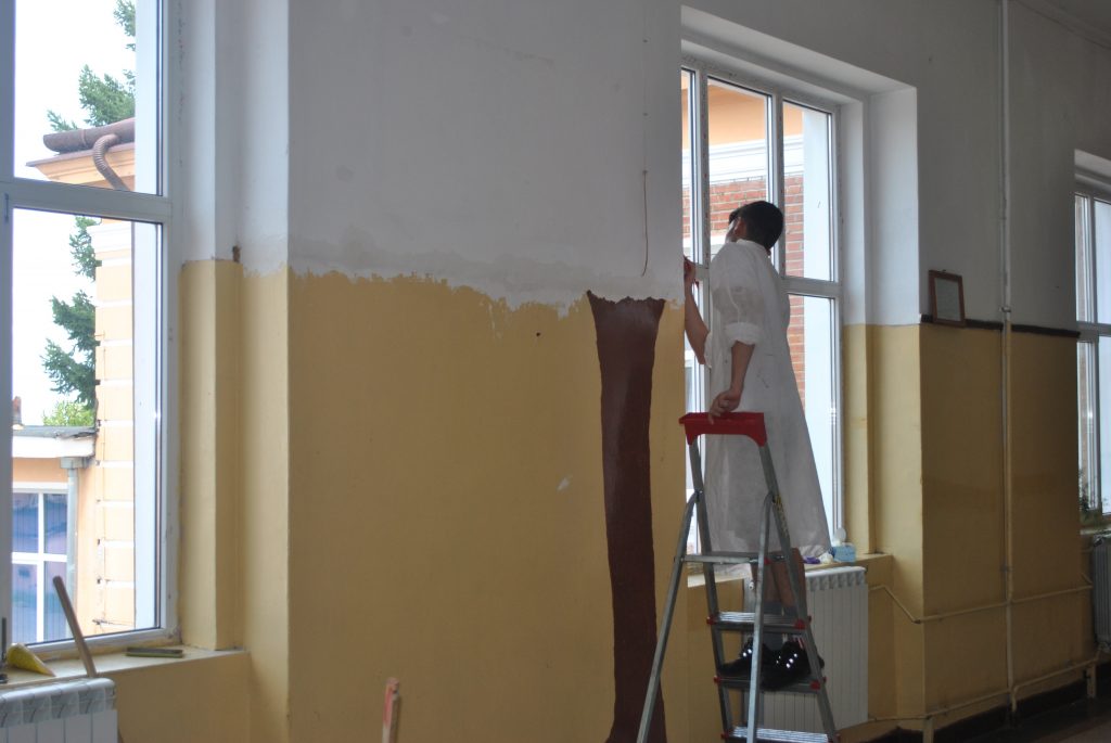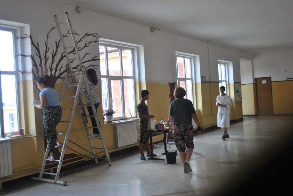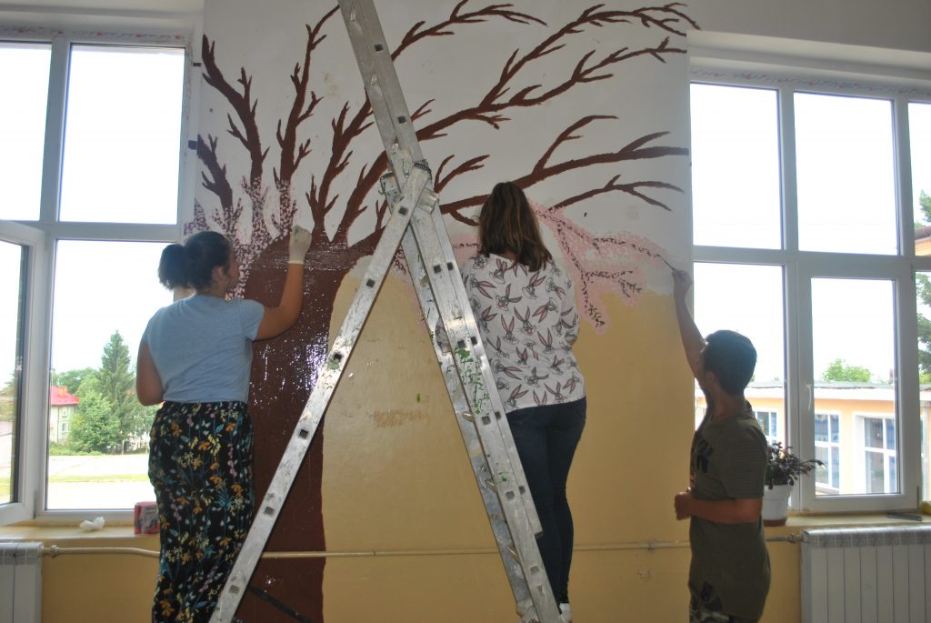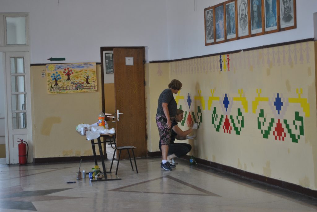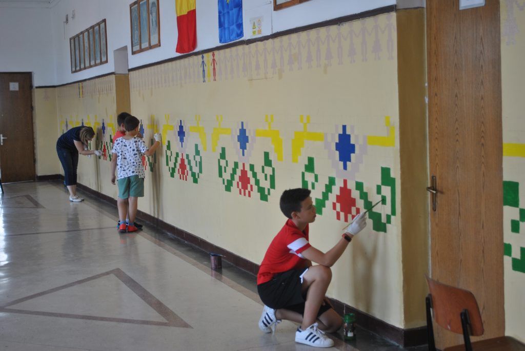 În plină vacanţă de vară i-am găsit pe o parte din elevii şcolii gimnaziale din cadrul Liceului Teoretic ,,Ion Codru Drăguşanu” din Victoria în activitate. La etajul clădirii, pe sala mare, aşa cum o numesc ei, o mână de copii însoţiţi de două profesoare şi de directorul adjunct vor să schimbe faţa etajului. Cu imaginaţie şi dibăcie lucrează de la începutul acestei luni în cadrul proiectului ,,Şcoala de vară”. Înarmaţi cu vopsele, pensule, şabloane, scări, dar şi cu răbdare pictează pereţii cu motive geometrice şi tradiţionale, dar şi cu elemente din natură. ,,Vrem ca şcoala noastră să fie mai atractivă, elevii să vină cu drag la şcoală. De aceea pictăm pereţii. La final totul va avea o altă faţă, va fi frumos” a spus Andrei Timoftă din clasa a V-a. De jur împrejur au fost desenaţi cu şabloane copii prinşi în horă şi motive geometrice care sunt colorate în verde, roşu, albastru şi galben. Pe doi dintre pereţi, copiii şi-au dorit să vadă cireşi. Adrei Jenea deşi a trecut în clasa a IX-a s-a alăturat elevilor de gimnaziu pentru a picta un cireş. Ştefania din clasa a VII-a vrea să picteze florile unuia dintre cireşi. ,,Va fi un spaţiu de relaxare pentru elevi. Sub cireşii pictaţi vrem să aşezăm două băncuţe” a explicat tot Andrei Timoftă. În echipa lor a venit şi David Grovu care este elev în clasa a VI-a în Spania, dar se afla în vacanţă în ţară.