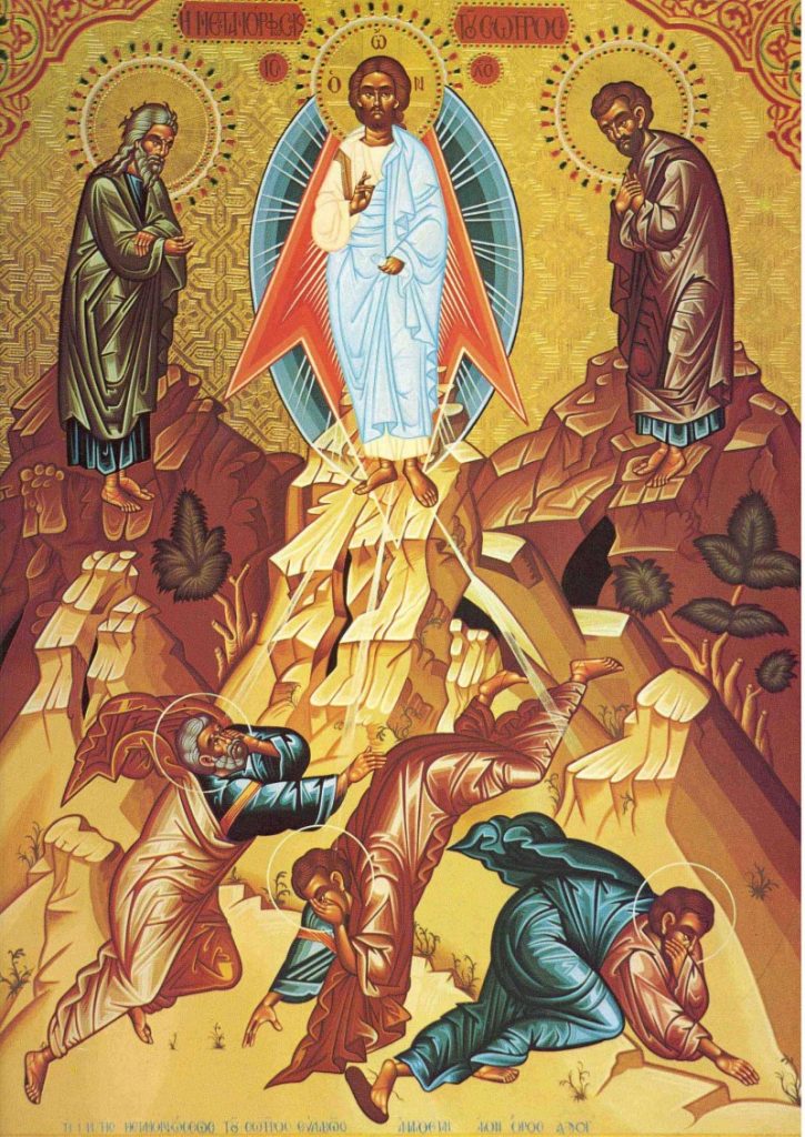 Sfântul Evanghelist Matei vorbeşte despre scena Schimbării la Faţă a Domnului. Iisus îi ia ,,cu sine“ pe cei mai apropiaţi din ceata celor 12 apostoli, pe Petru şi cei doi fraţi- Iacob şi Ioan, fiii lui Zevedeu. I-a dus pe ,,un munte înalt“ şi El S-a schimbat la Faţă înaintea lor. ,,Şi S-a schimbat la faţă înaintea lor şi a strălucit faţa Lui ca soarele, iar veşmintele Lui s-au făcut albe ca lumina“ spune Matei. Timpul şi spaţiul s-au estompat, lăsând loc unei conversaţii între Iisus, Moise şi Ilie, care apar dintr-o lume la care apostolii nu au avut până atunci acces. Curios este că Petru îi recunoaşte pe cei doi: ,,Doamne, bine este să fim noi aici; dacă voieşti, voi face aici trei colibe: Ţie una, şi lui Moise una, şi lui Ilie una“. Nu a mai avut când să-şi ducă planul la finalizare pentru că cei doi au dispărut, după ce un nor luminos a acoperit întreaga scenă şi un glas misterios s-a auzit din el- ,,Acesta este Fiul Meu cel iubit, în Care am binevoit; pe Acesta ascultaţi-L“. Acelaşi glas, al Tatălui Ceresc, s-a auzit şi la scena Botezului lui Iisus în Iordan de către Ioan, ultimul proroc al Vechiului Testament. Prezenţa lui Moise şi Ilie nu este întâmplătoare: Moise este cel care le-a dat evreilor Legea, iar Ilie reprezintă arhetipul profeţiei din Vechiul Testament. Sfântul Ioan Damaschin spune că Iisus s-a arătat ucenicilor, pe Tabor, cu adevărata Sa faţă, nu s-a schimbat, nu a luat o altă înfăţişare, iar Sfântul Ioan Gură de Aur remarcă faptul că Hristos nu a dezvăluit întreaga dumnezeire, ci doar o parte din energia Sa. Schimbarea la Faţă a Domnului este ea însăşi o taină care ascunde revelarea Împărăţiei Cerurilor. Schimbarea i-a afectat şi pe ucenici în toată fiinţa lor psihosomatică, pentru că nu au văzut lumina sfântă doar prin mintea lor, ci şi prin simţurile trupeşti, întărite ele însele de harul cel nezidit al lui Dumnezeu şi au fost transformate pentru a vedea aceste lucruri ce se perindau înaintea ochilor lor. Ochii lor- spune Sf. Grigorie Palama- au fost transformaţi pentru a vedea slava lui Dumnezeu.