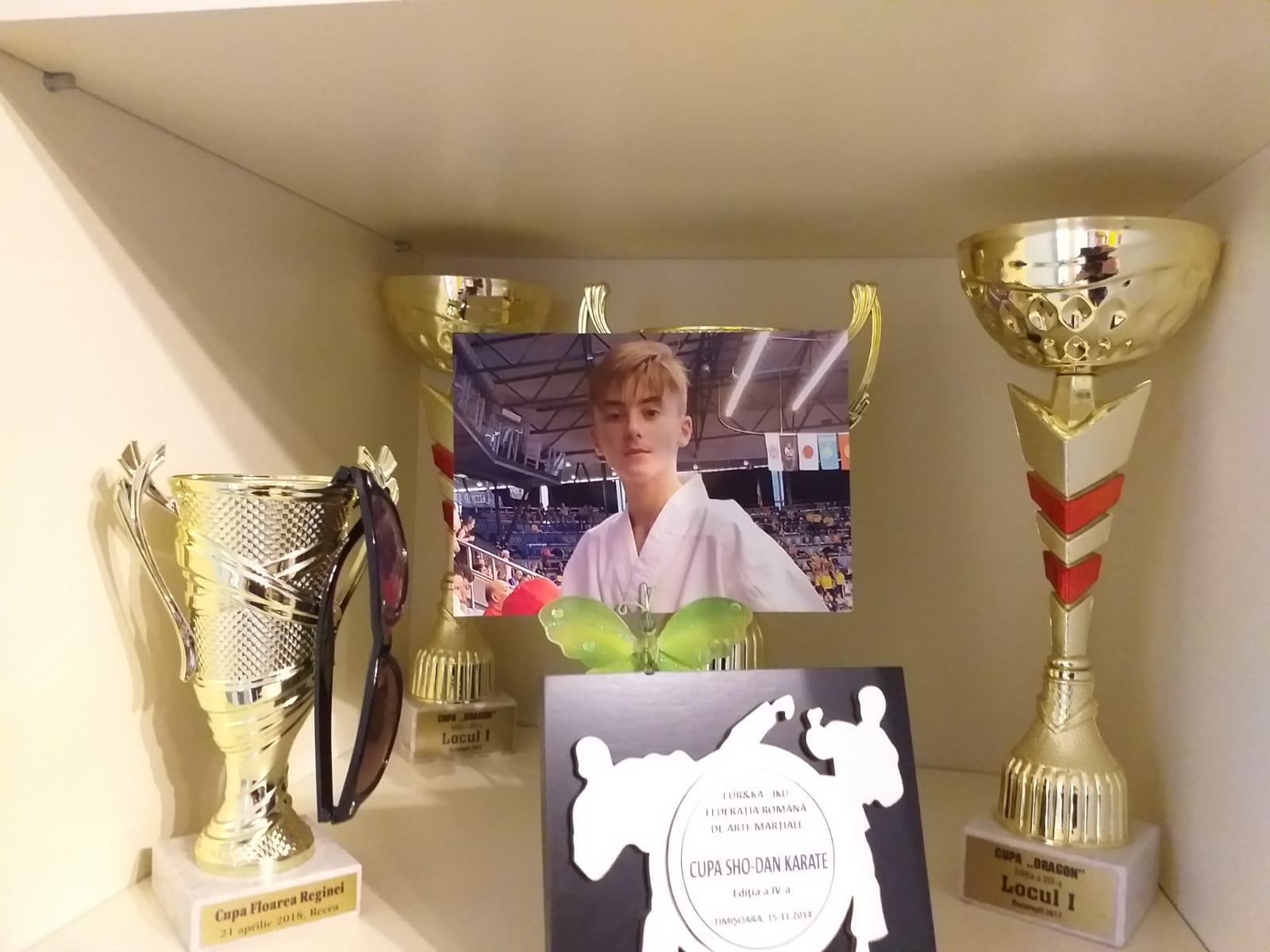 ,,Alin are acum doisprezece ani şi şase luni, s-a născut la data de 13 ianuarie 2007, şi a început să practice Karate la vârsta de trei ani şi şase luni. Când era mic, îl luam cu mine la sală şi îl lăsam pe bancă. Nu l-am dus cu ideea preconcepută să se apuce de Karate, îl lăsam să se uite în timp ce eu îmi vedeam de antrenamente. El se uita la început curios, ca orice copil. A fost atras de ceea ce a văzut la antrenamente astfel încât Laura, soţia mea, îl surprindea în camera lui în timp ce încerca să pună în aplicare ceea ce vedea la sală. La un moment dat, şi-a susţinut în faţa mea dorinţa de a intra în formaţie, deşi soţia mi-a zis să nu-l iau, că e prea mic şi să nu mă încurce mai mult. Dar copilul a venit la mine şi mi-a zis: ,,Vreau să fac şi eu antrenament“. De atunci l-am băgat în formaţie. La prima lui competiţie era doar cât masa. După un an, a reuşit să obţină locul I la Kata (N.R- luptă imaginară cu mai mulţi adversari) în cadrul Cupei României. Primul lui cadou, ce ţine de Karate, a fost o pereche de mănuşi pentru kumite. A continuat apoi competiţiile. Este înnebunit după competiţie, acolo este plăcerea lui. Alin intră acum în clasa a VI-a şi învaţă la Școala Gimnazială ,,Ovid Densuşianu“. L-am dat la o clasă normală, nu una de profil, şi nici de muzică“ a spus profesorul Cătălin Răduleţ.