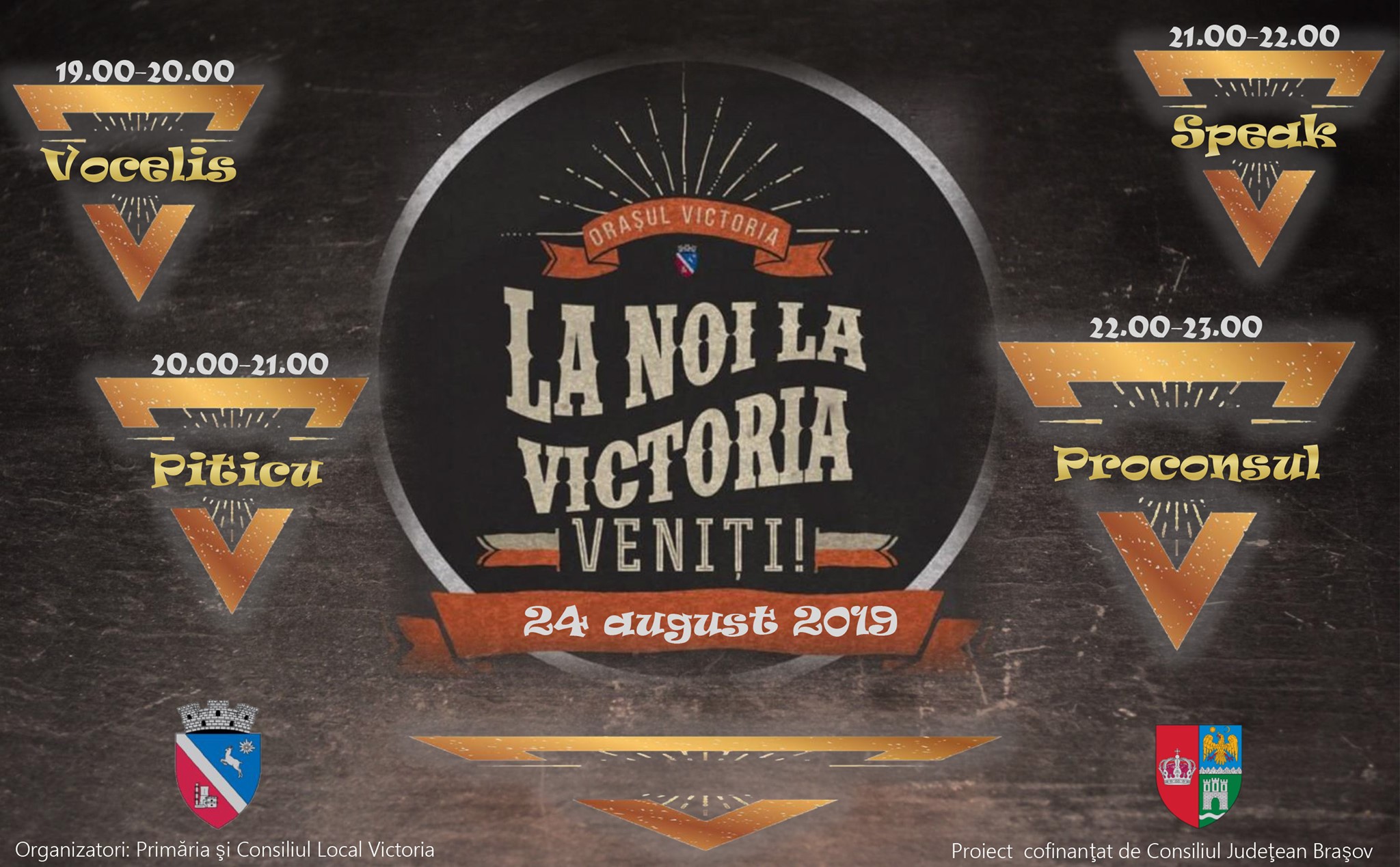 Localnicii din Ţara Făgăraşului sunt invitaţi în zilele 23, 24, 25 august 2019 la Victoria, unde se va derula tradiţionala sărbătoare ,,Zilele oraşului Victoria”, dar şi festivalul ,,La noi, la Victoria veniţi!”.  Primăria şi CL Victoria sunt organizatării manifestării, care au invitat artişti şi formaţii de muzică populară şi uşoară, care vor evolua pe scena montată în centrul urbei, în faţa casei de cultură. În prima zi, 23 august, programul începe la ora 19.00, iar sâmbătă, tot de la ora 19.00, vor urca pe scenă artişti de muzică folc, seara fiind încheiată de Proconsul şi artificii. Tot sâmbătă, începând cu ora 16.30, primăria organizează o masă rotundă la care sunt invitaţi localnicii care au contribuit la construcţia oraşului. Manifestarea va marca 70 de ani de la înfiinţarea oraşului Victoria.  Duminică, 25 august, de la ora 16.30, vor urca pe scenă artişti şi ansambluri de muzică populară. Seara va fi încheiată de renumita formaţie ARMONIA.
