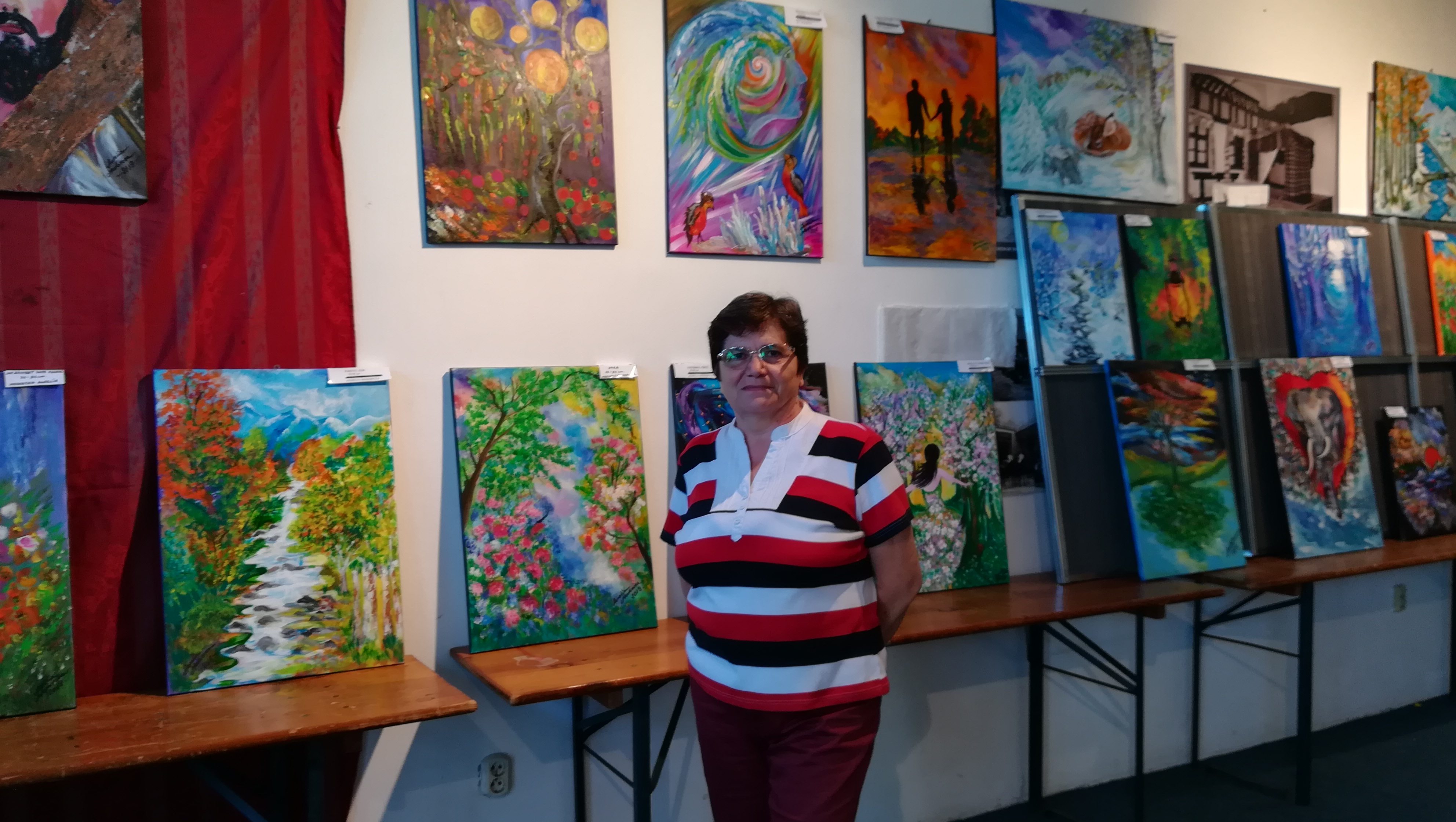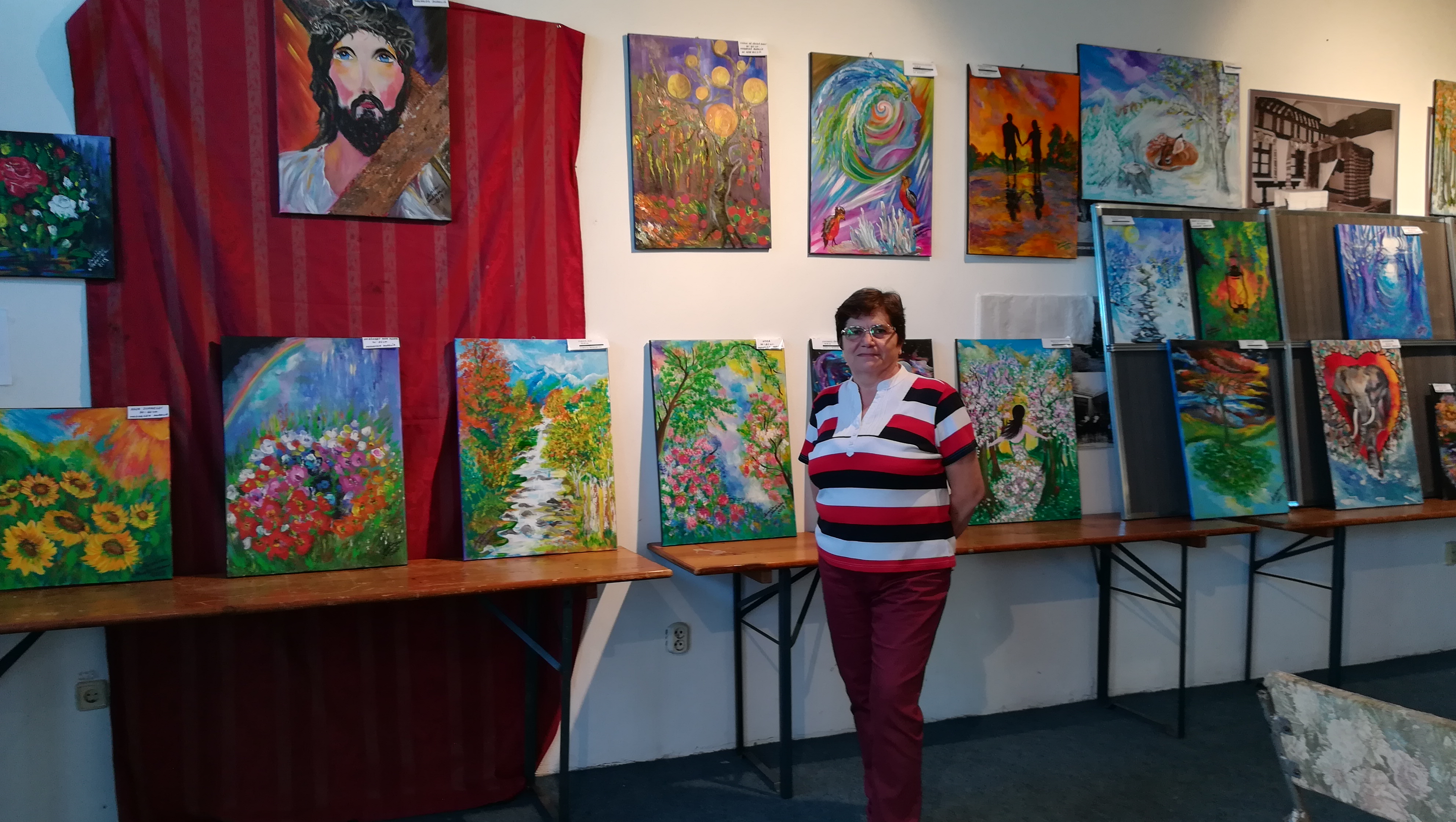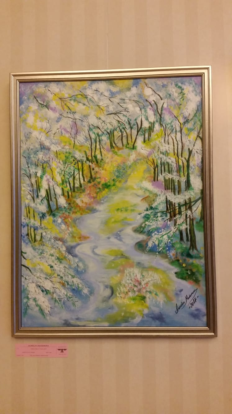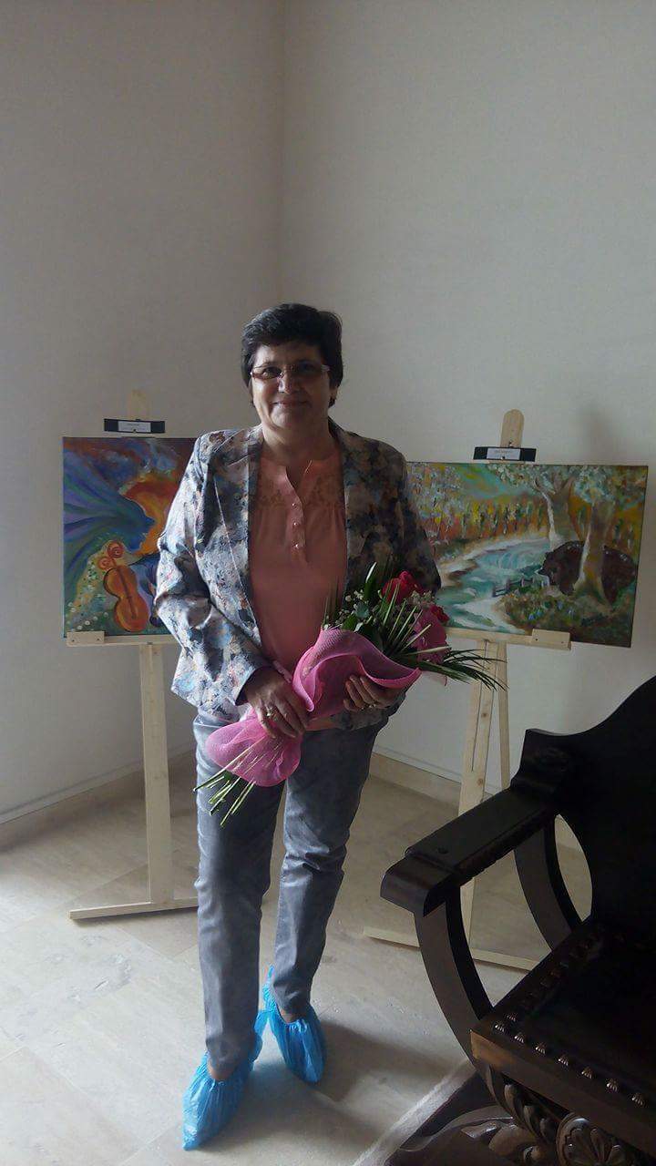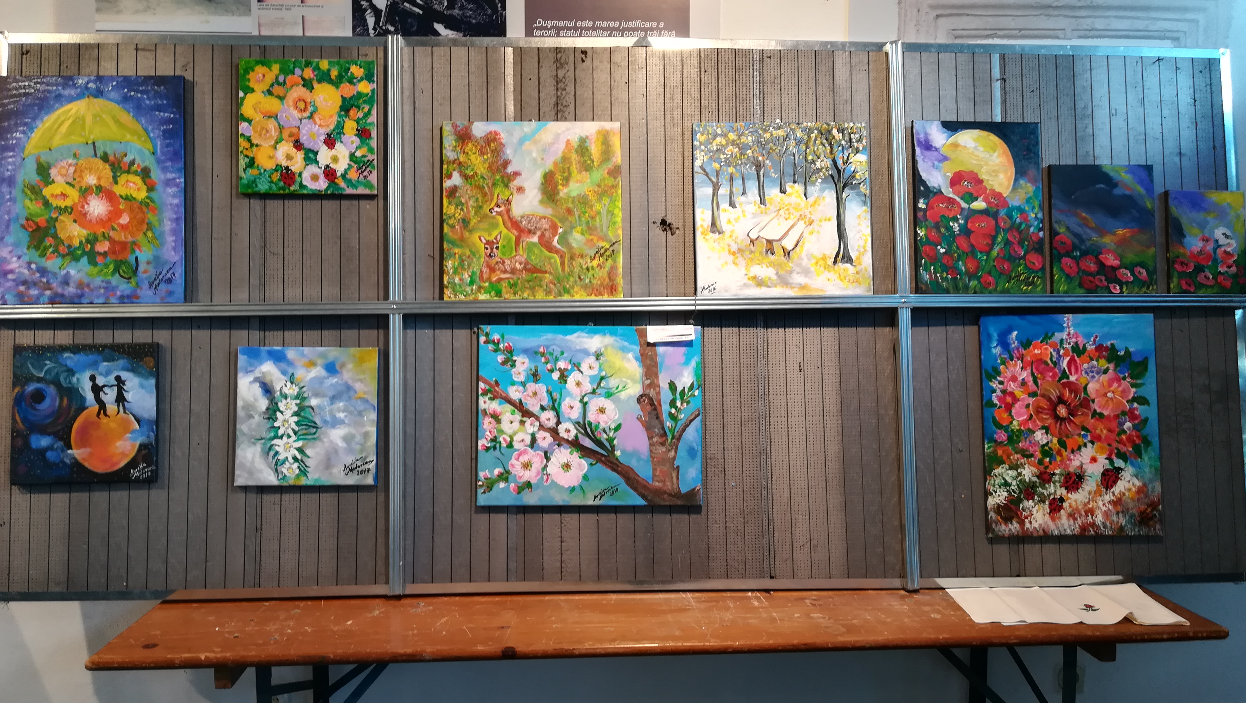 Împreună cu artista am făcut un tur al exponatelor. Fiecare dintre ele are o poveste care impresionează. ,,Pot spune că după fiecare pictură îmi pare rău, fiecare tablou înseamnă o poveste pentru mine. ,,Mireasma primăverii” îmi aduce aminte de o prietenă care, azi, nu mai este printre noi. Ei îi plăcea prinăvara şi i-am pictat acest anotimp. Acest copac (n.r. referindu-se la alt tablou) este la bătrâneţe şi se vede la tinereţe. Elefantul din acest tablou reprezintă o eliberare din focul vieţii, tinde spre libertate. În acest tablou prezint un joc cu luna, într-o seară când era lună plină şi se vedeau păsările de noapte. Sunt foarte optimistă şi de aceea tablourile mele sunt luminoase. Starea mea este reliefată în tablouri prin culoare şi lumină. Aici am pictat lămpaşul, bătrânul lămpaş. M-a inspirat o pană de curent ivită în timp ce pictam. Mi-am adus aminte de întunericul din regimul trecut, iar când a venit curentul am pictat acest lămpaş” a spus artista.