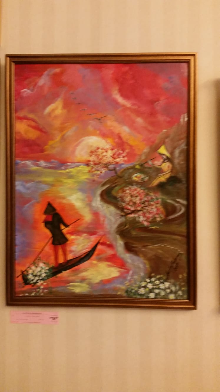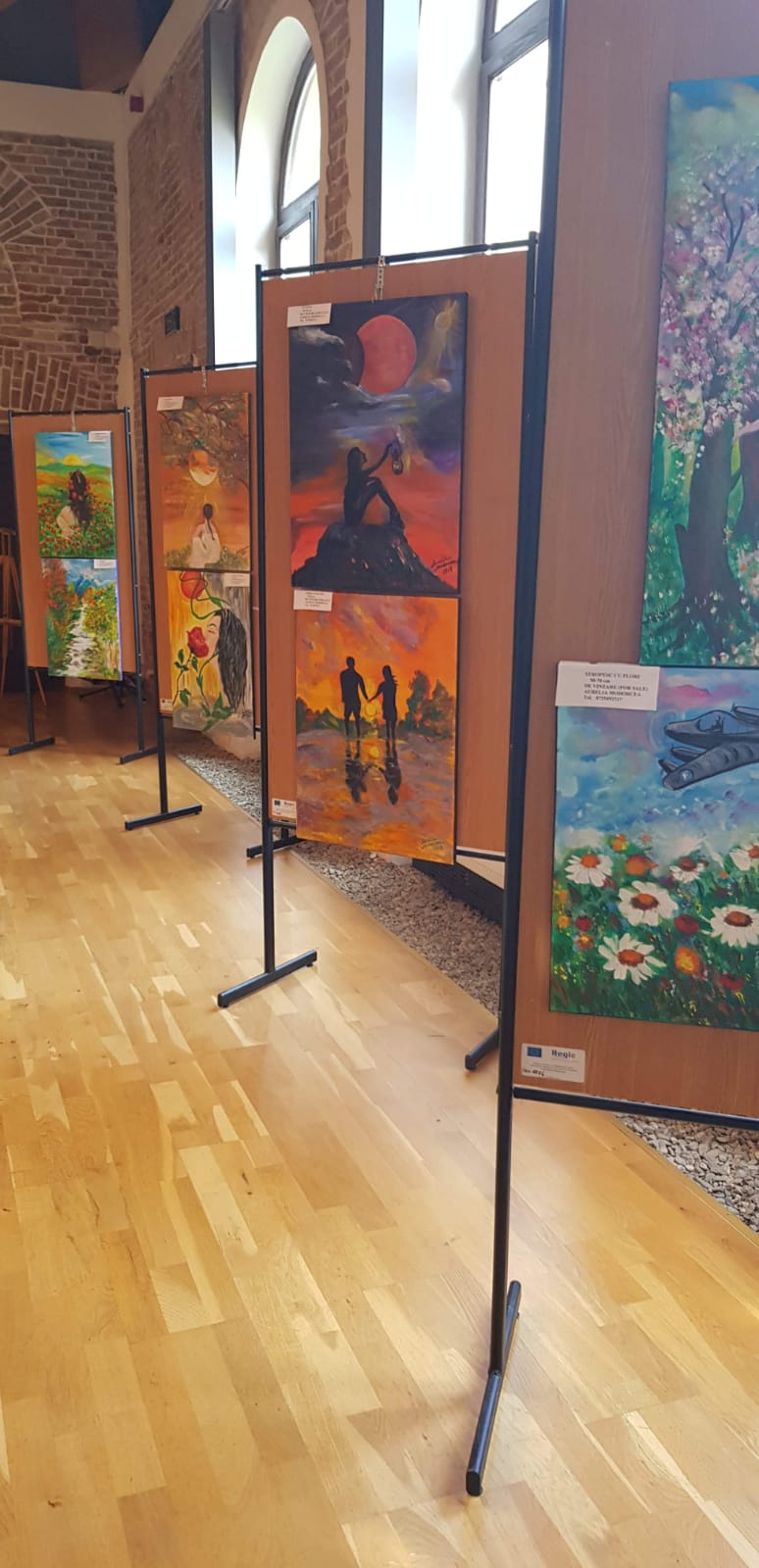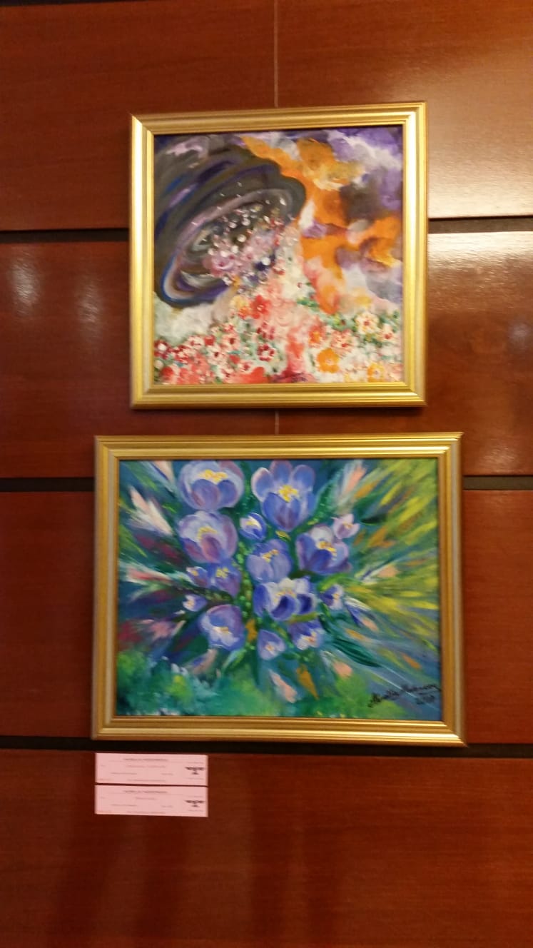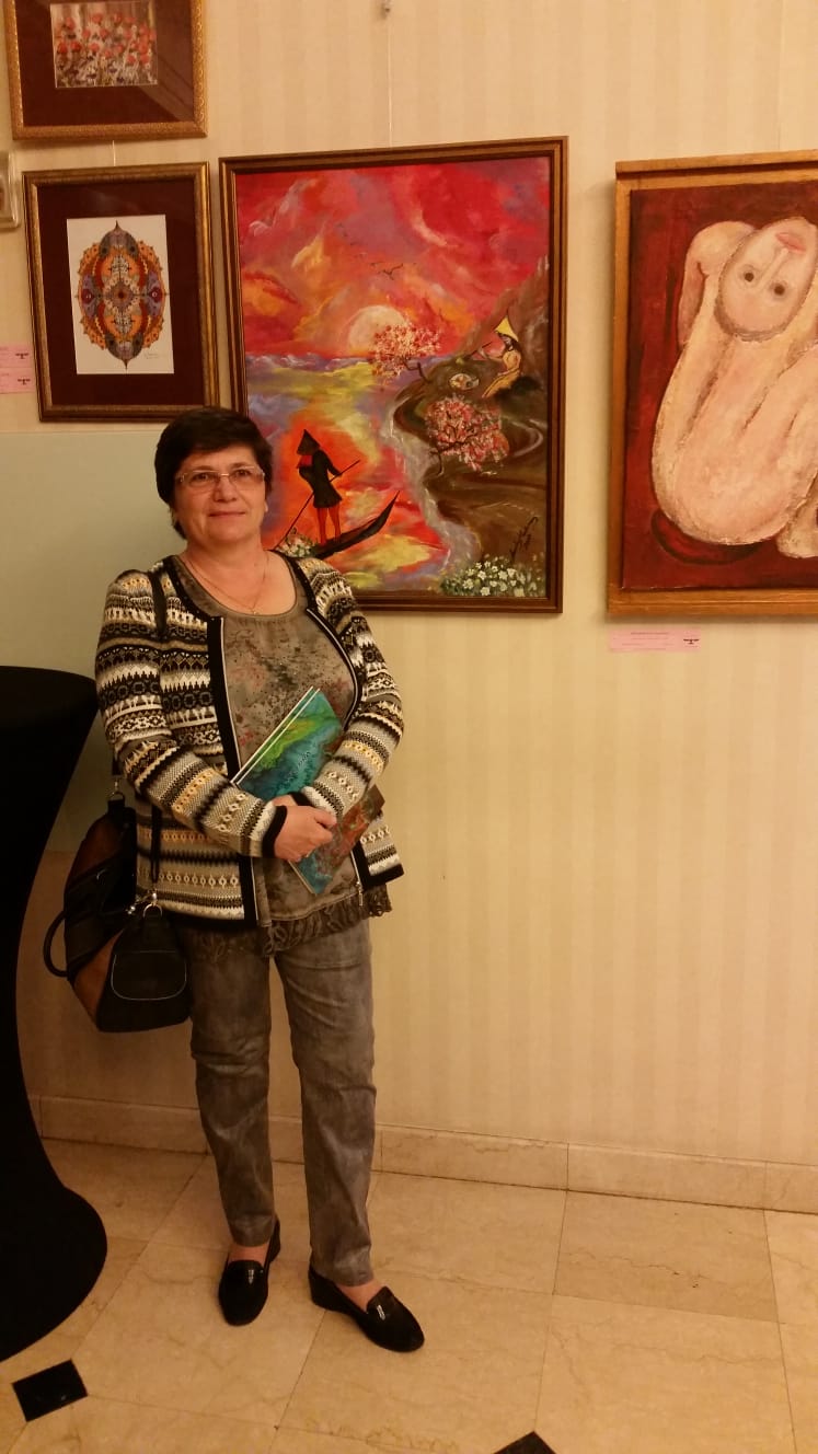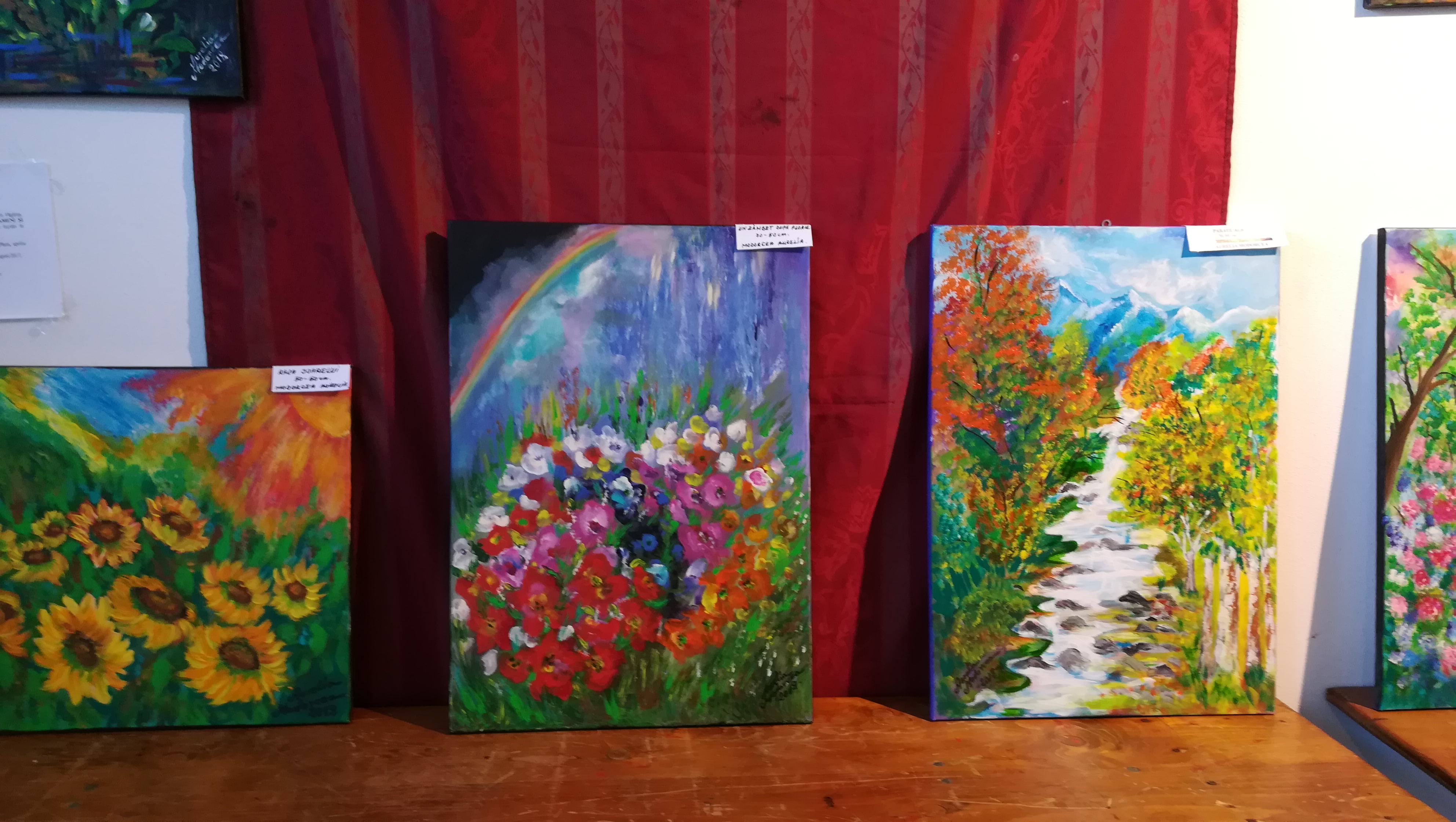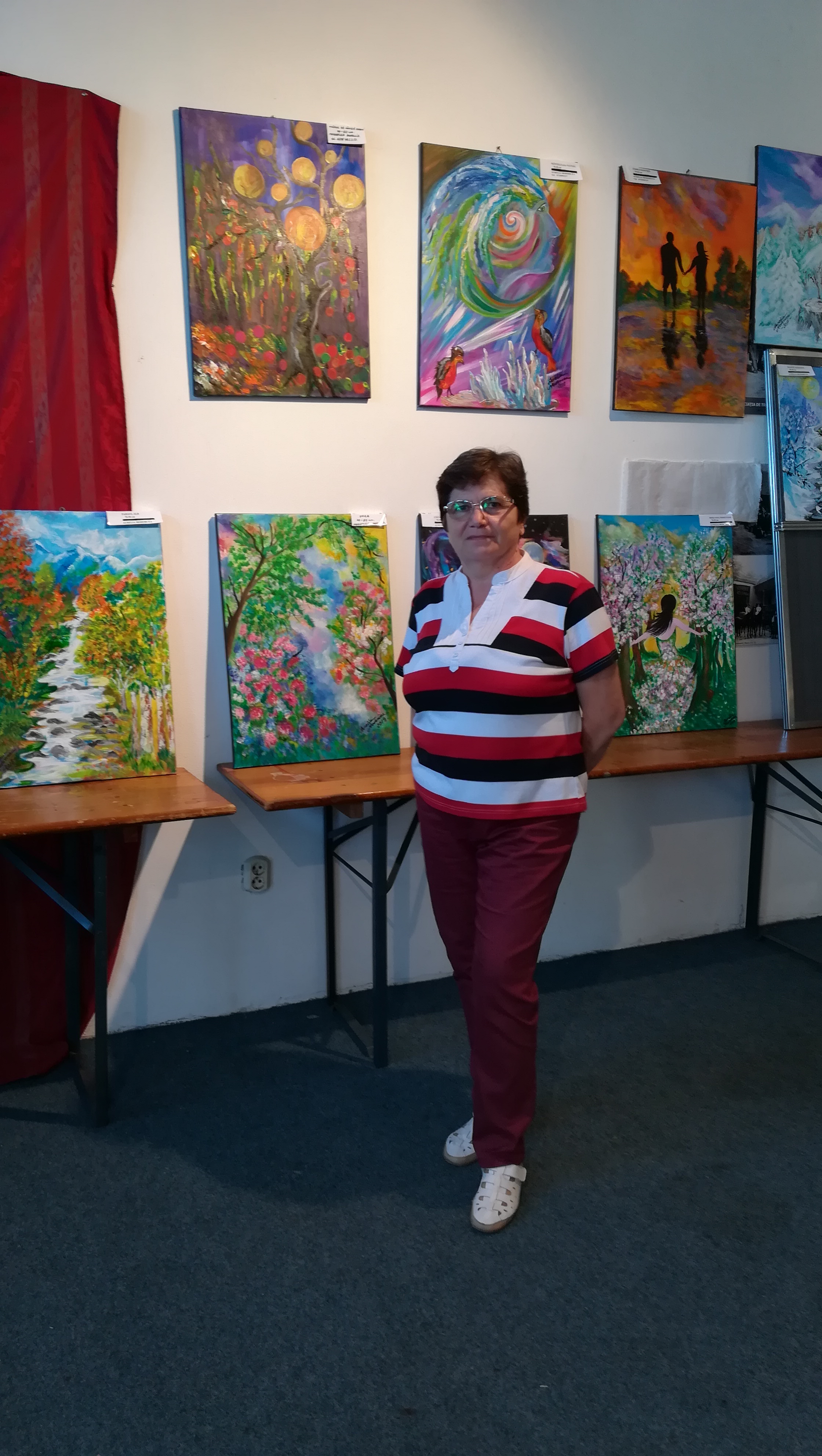 Împreună cu artista am făcut un tur al exponatelor. Fiecare dintre ele are o poveste care impresionează. ,,Pot spune că după fiecare pictură îmi pare rău, fiecare tablou înseamnă o poveste pentru mine. ,,Mireasma primăverii” îmi aduce aminte de o prietenă care, azi, nu mai este printre noi. Ei îi plăcea prinăvara şi i-am pictat acest anotimp. Acest copac (n.r. referindu-se la alt tablou) este la bătrâneţe şi se vede la tinereţe. Elefantul din acest tablou reprezintă o eliberare din focul vieţii, tinde spre libertate. În acest tablou prezint un joc cu luna, într-o seară când era lună plină şi se vedeau păsările de noapte. Sunt foarte optimistă şi de aceea tablourile mele sunt luminoase. Starea mea este reliefată în tablouri prin culoare şi lumină. Aici am pictat lămpaşul, bătrânul lămpaş. M-a inspirat o pană de curent ivită în timp ce pictam. Mi-am adus aminte de întunericul din regimul trecut, iar când a venit curentul am pictat acest lămpaş” a spus artista.