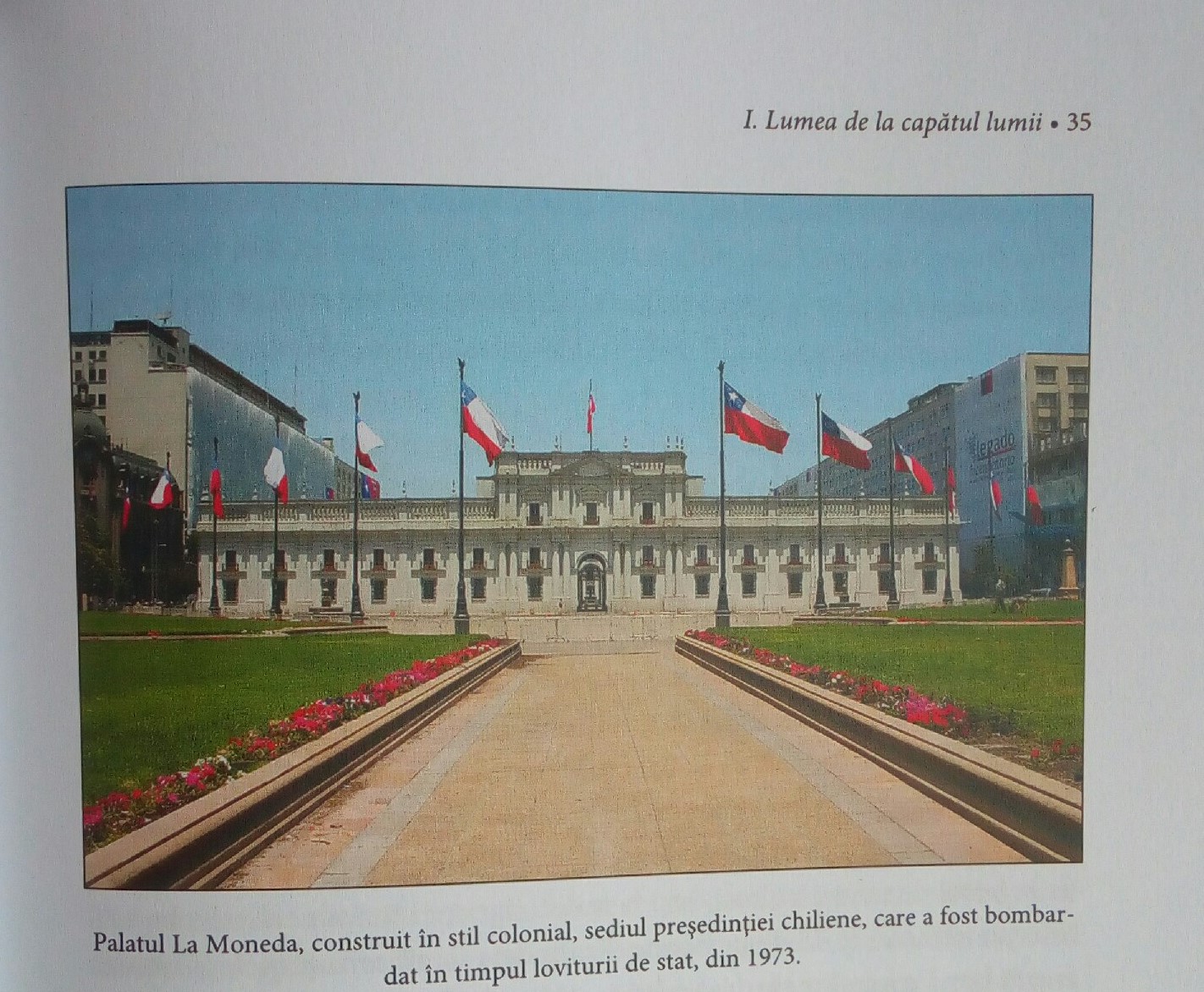Capitolul V, ,,Președintele Salvador Allende”, un apogeu al relatării, ilustrează cu forță virtuțiile jurnalistice ale autorilor. Asemenea unei compoziții românești în care conflictul se dezvoltă gradat, atinge tensiunea maximă și produce un deznodământ tragic, se evocă evenimentele loviturii de stat militare din 11 septembrie 1973, în urma căreia generalul Augusto Pinochet a preluat puterea, iar președintele în funcție, ales democratic cu trei ani în urmă, s-a sinucis la sediu, în palatul ,,La Moneda”, luat cu asalt de pe sol și din aer. A urmat o dictatură militară de 17 ani soldată cu crime (oficial 3000), persecuții și expulzări în afara țării pe considerente politice. Reconstituirea momentelor se bazează pe o carte de referință a unui maestru al reportajului: Curzio Malaparte în ,,Tehnica loviturii de stat” (1931), ale cărei tipologii consemnate în Rusia (Lenin), Germania (Hitler), Italia (Mussolini) se confirmă și în Chile, iar calapodul se vede, prin analogie, și în România anului 1989. Evocarea prinde un viu contur epic prin punerea în rol a mai multor „voci narative” autorizate, martori direcți sau indirecți ai evenimentului. Relevante dintru început sunt mărturiile fiicei lui Salvador Allende, aflată lângă tatăl său, până aproape de clipa fatală, publicate în revista ,,Luea” din noiembrie 1973, apoi paginile cu caracter autobiografic din romanele sale de succes, traduse și în limba română. Autorii dezvăluie implicațiile politice românești în conjunctura momentului, prilejuite de vizita oficială efectuată de Nicolae Ceaușescu în perioada 29 august-20 septembrie 1973 în opt țări din America Latină, între care era cuprinsă și Chile. Puciul a surprins delegația română în Columbia, Chile ar fi urmat în intervalul 15-17 septembrie, însă vizita a trebuit anulată, ca și următoarea, din Argentina. Un impas greu de suportat și reflectat acum de scriitorul Petru Popescu, din delegația jurnaliștilor, ziarista Anca Voican, de la revista Lumea, ce a purtat un ultim interviu cu Allende, Ilie Ciurescu, redactor de politică externă la TVR, Ștefan Andrei, secretar al CC Al PCR, persoane ce s-au aflat cumva în interferență, la fața locului, cu evenimentele care au afectat și politica românească. Prin harul investigației și al dialogului incitant, Ilie Rad reușește să readucă la lumină pagini inedite din trecutul apropiat al diplomației românești, meritul unor oameni politici și jurnaliști, cunoscuți generației mai vârstnice, ce și-au exercitat profesia cu patriotism și demnitate. Stilul agreabil al relatării nu se poate separa de materialul iconografic bogat variat și adecvat subiectului. Fie instantanee, fie preluate din surse documentare, ilustrațiile concretizează reprezentările cititorului, aducând în plus și o desfătare vizuală. În concluzie, popasul la extremitatea unui punct cardinal al Planetei prilejuiește atât creionarea unor secvențe din panorama lumii de azi, cât și a unei mostre de practicare a jurnalismului. (prof. LIVIU IOANI)