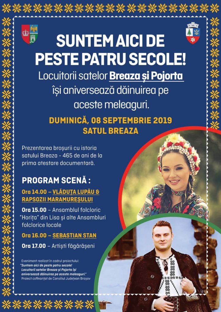 În urmă cu 465 de ani, adică pe la 1554, s-a vorbit pentru prima dată despre satul Breaza de la poalele Munţilor Făgăraş. Sătenii de azi se mândresc cu istoria locului şi sărbătoresc împlinirea celor aproape cinci veacuri printr-un eveniment cultural. Duminică, 8 septembrie a.c., localnicii se adună la biserică, la slujba de duminică, marcată şi de praznicul ,,Naşterea Maicii Domnului”. La ora 14.00 artişti şi ansambluri folclorice vor evolua pe scena amplsată în centrul satului. Primăria şi CL Lisa împreună cu CJ Braşov au finanţat proiectul cultural intitulat ,,Suntem aici de peste patru secole!” pentru a marca vechimea satelor Breaza şi Pojorta. Un colectiv de localnici au strâns informaţii vechi şi documente şi au editat o broşură despre istoria locului, care va fi prezentată în cadrul acestui eveniment. Muzica populară, dansurile vor înveseli participanţii. Cap de afiş sunt Vlăduţa Lupău, Sebastian Stan şi artiştii locali. Ansamblul folcloric ,,Horiţa” din Lisa va prezenta o suită de dansuri populare, dar programul va mai fi completat şi de alte formaţii folclorice din Ţara Făgăraşului. ,,În acest an vom sărbători la Breaza cu sprijinul C J Braşov care a finanţat acest proiect. Sunt 465 de ani de la prima atestare documentară a satului Breaza. Invităm iubitorii de folclor şi de istorie să participe la acest eveniment” a spus Gheorghe Moga, priarul comunei Lisa.