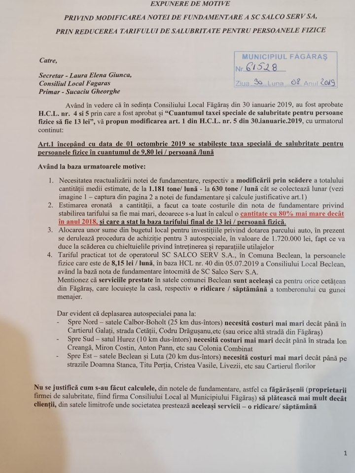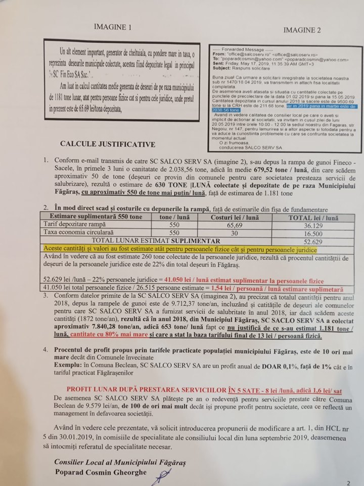 ,,Salco a fost subiectul care m-a înverşunat foarte mult şi care m-a determinat să preiau funcţia de consilier local rămasă vacantă, deşi nu aveam de gând ca în acest mandat să fac parte din CL Făgăraş. Dar văzând că lucrurile nu stau aşa cum s-au aşteptat făgărăşenii am acceptat să intru în CL Făgăraş şi să spun lucrurilor pe nume. Am făcut o solicitare de informare la Salco în calitatea de consilier local. Aşa cum procedează primarul au procedat şi cei de la Salco, mi-au pus la dispoziţie informaţiile abia în a 29 zi după depunerea solicitării. Am cerut să mi se comunice ce cantitate de deşeuri au dus la groapa de gunoi de la Săcele în 2018, şi cât au dus în perioada ianuarie- martie 2019. Am făcut o analiză şi am văzut că lucrurile stipulate în nota de fundamentare a majorării preţului la salubritate nu sunt reale. Am mai solicitat în urmă cu peste 3 săptămâni să-mi comunice datele şi pentru perioada aprilie-iunie 2019, pentru a putea face o analiză completă. Nu am primit răspuns. Atunci, cu informaţiile obţinute am conceput un proiect de hotărâre pe care l-am depus la Primăria Făgăraş în ziua de vineri, 30 august 2019” a explicat Cosmin Poparad.