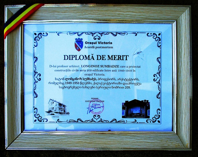 La 7 decenii distanţă, conducerea oraşului Victoria i-a acordat o diplomă de merit, postmortem, arhitectului Longinoz Sumbadze,  pentru meritul de a proiecta imobilele din oraş. Diploma a fost înmânată de primarul Gheorghe Cristian  fiului fostului arhitect care a fost invitat la Victoria. În data de 20 septembrie a.c. administraţia locală de la Victoria a avut parte de invitaţi de seamă. Ambasadorul Georgiei la Bucureşti, Nikoloz Nikolozishvili,  şi urmaşul arhitectului care a proiectat zona centrală a oraşului, Nodar Sumbadze,   au vizitat urbea şi expoziţia realizată cu fotografiile ce înfăţişau  lucrările de edificare a oraşului. Nodar Sumbadze este şi el arhitect şi profesor la Academia de Arte din Tbilisi. Din delegaţia Excelenţei Sale a făcut parte şi  Levan Kalandarishvili, ucenicul arhitectului  Longinoz Sumbadze, care este  profesor la Universitatea Liberă din Tbilisi. ,,Scopul întâlnirii a fost de a aduce un omagiu arhitectului Longinoz Sumbadze care a proiectat primele clădiri din oraşul nostru. Întâlnirea a vut loc la Casa de Cultură, unde am amenajat o expoziţie de fotografie  cu  blocurile construite în perioada 1949 – 1958.  Am organizat şi o  masă rotundă în cadrul căreia am înmânat  diploma de merit pentru Nodar Sumbadze, fiul arhitectului georgian” a  spus primarul Gheorghe Cristian. Expoziţia de fotografie a fost intitulată ,,Case georgiene în Victoria”.   Tot în memoria renumitului arhitect a fost montată o placă comemorativă în parcul din faţa bisericii din zona Pieţei, iar dezvelirea acesteia a fost făcută de ambasadorul  Nikoloz Nicolozishvili şi primarul Gheorghe Cristian. Acţiunea a fost însoţită şi de o slujbă religioasă de pomenire oficiată de preotul Octavian Smădu.
