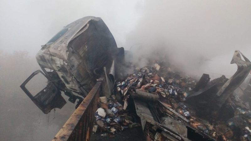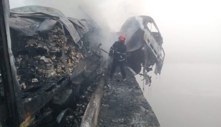 Accident grav la Bradu. Un TIR a luat foc, iar un pasager a sărit în Olt şi este căutat de pompieri