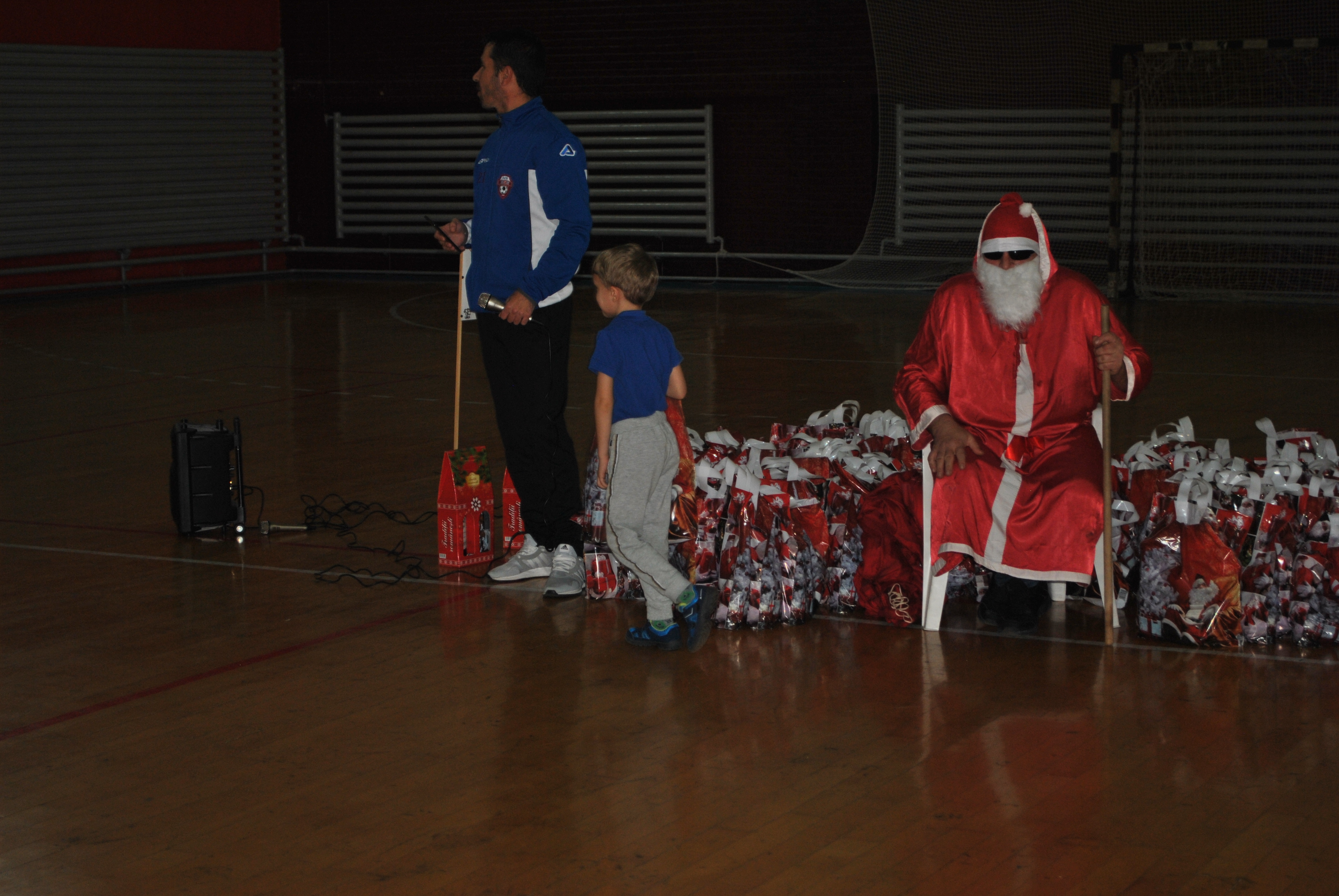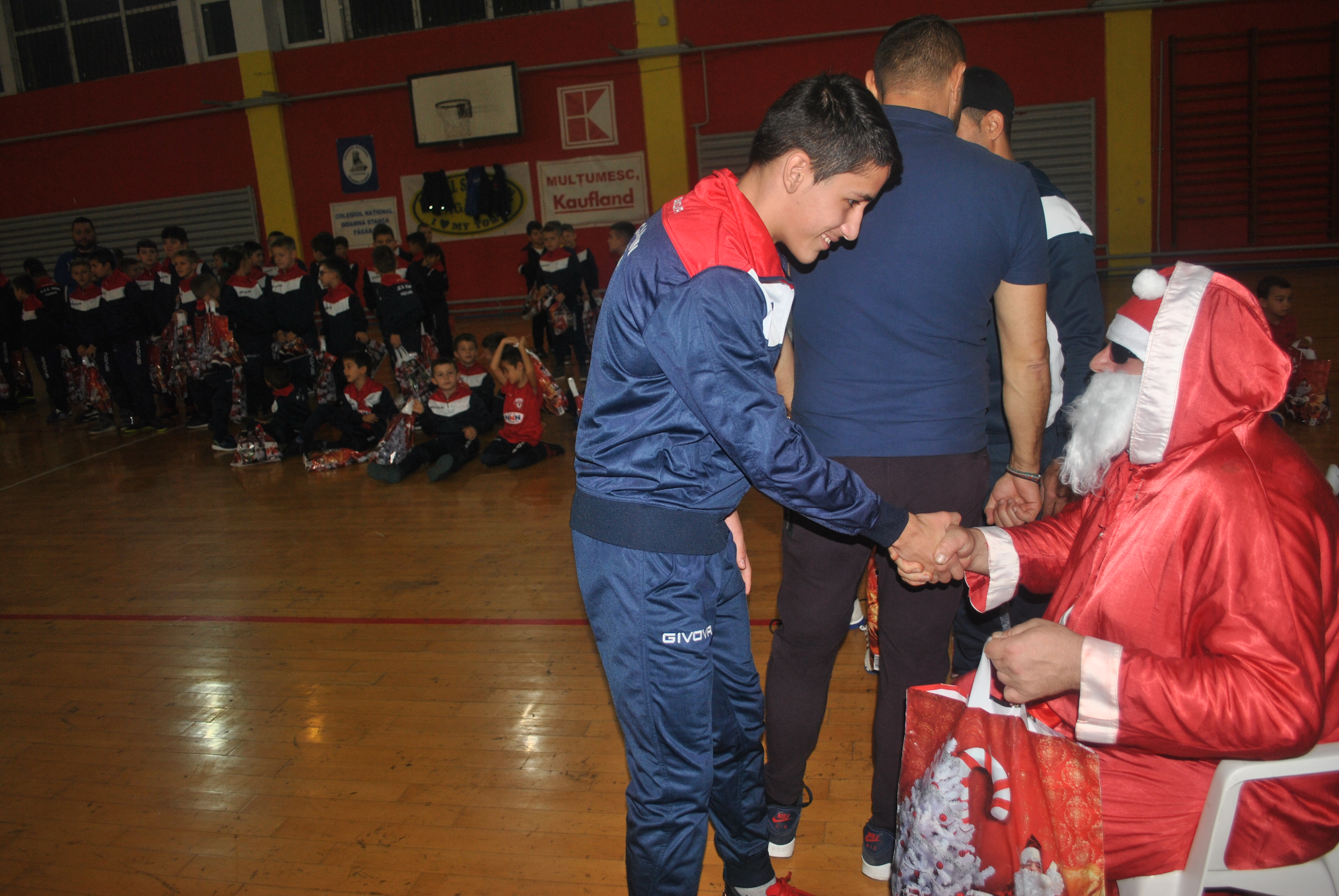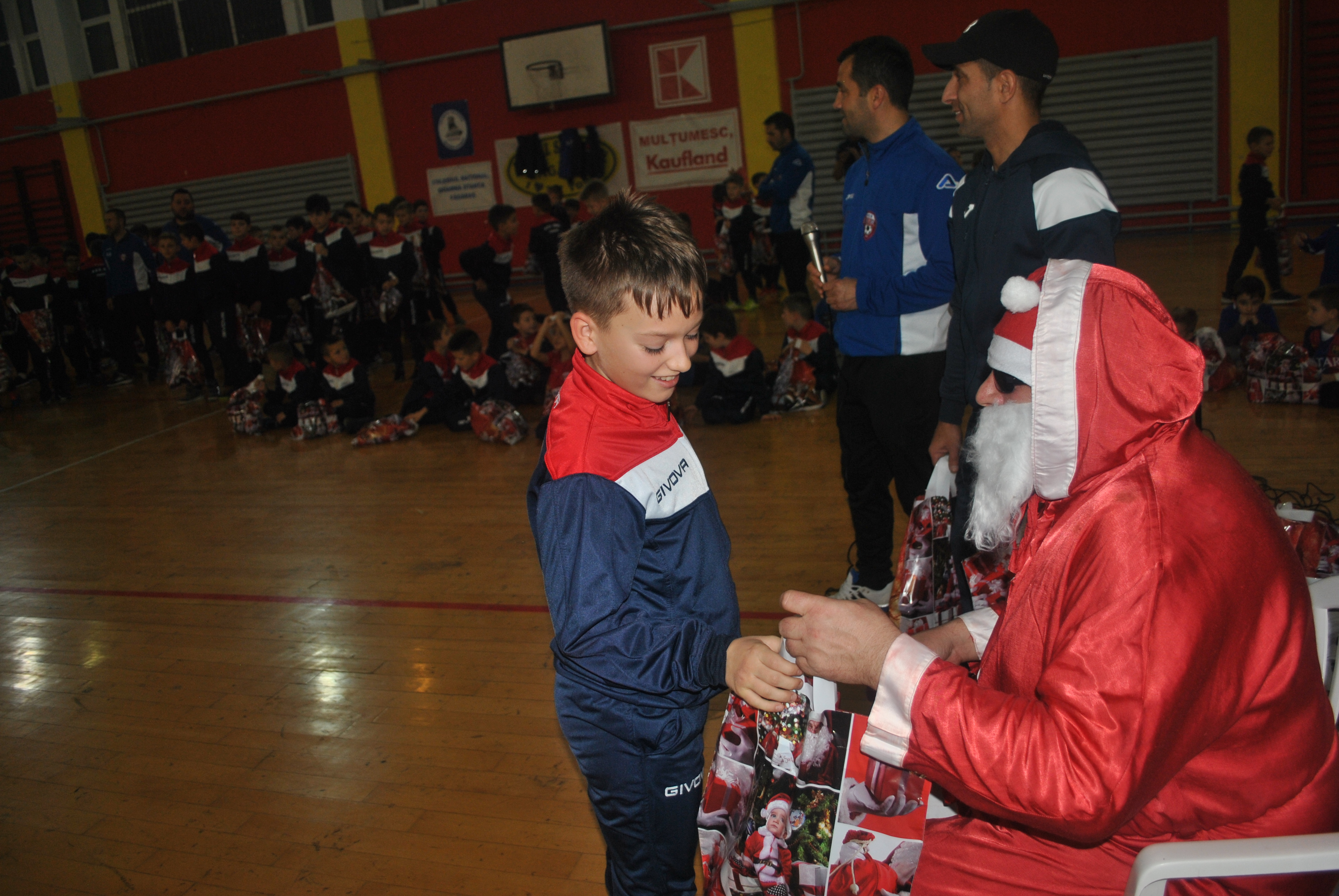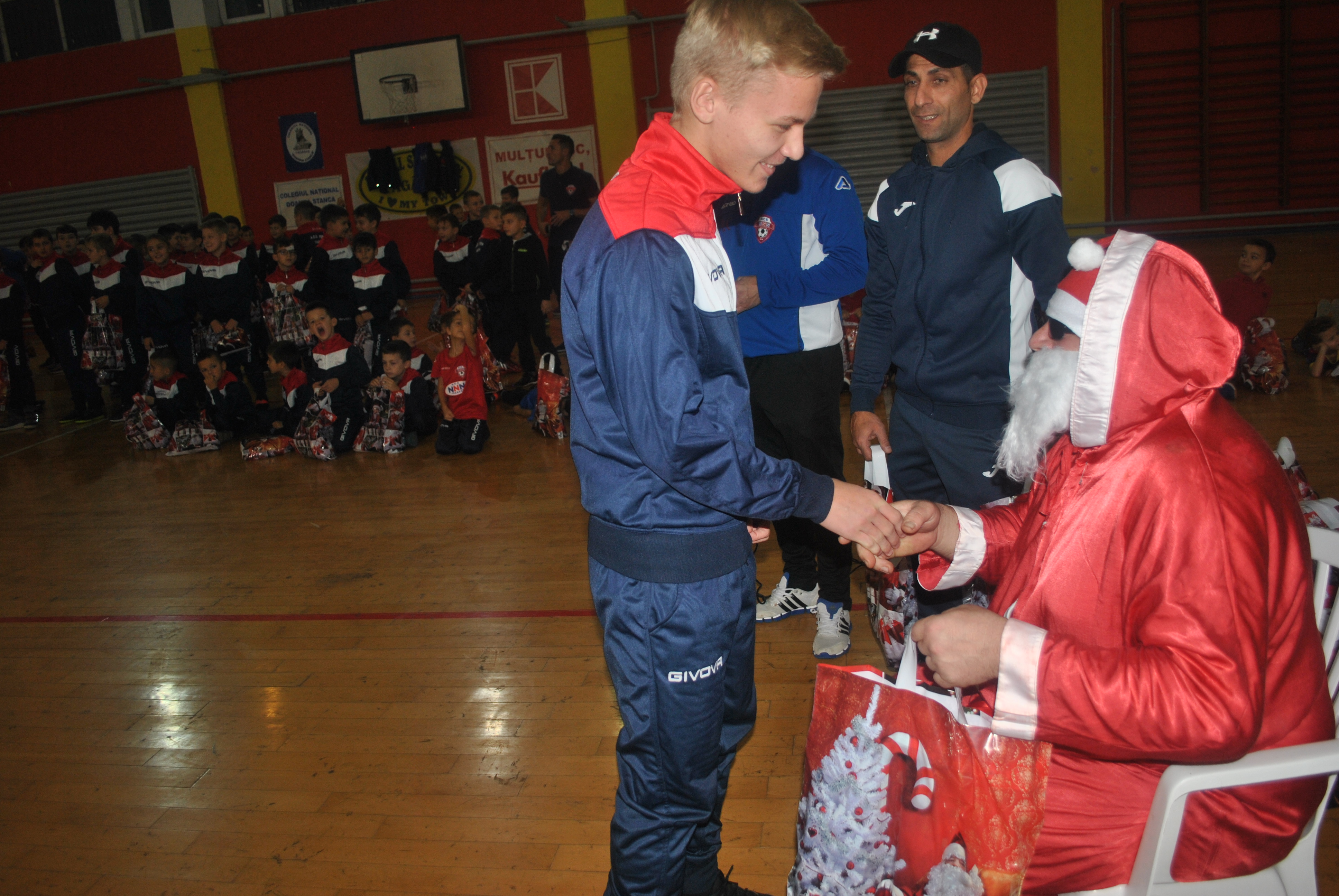 Copiii au colindat frumoasa colindă ,,Dom, dom, să-nălţăm” adresând-o părinţilor care au umplut tribuna sălii de sport, antrenorilor, patronului şi angajaţilor clubului, dar mai ales lui Moş Crăciun. Fiecare antrenor al celor peste 120 de copii care activează la clubul NNN şi-a invitat sportivul în faţa Moşului, care le-a dăruit pachete cu dulciuri. Cu o disciplină desăvârşită, copiii şi-au salutat antrenorul şi au primit apoi darurile. Părinţii prezenţi în sală au imortalizat serbarea, video şi foto.