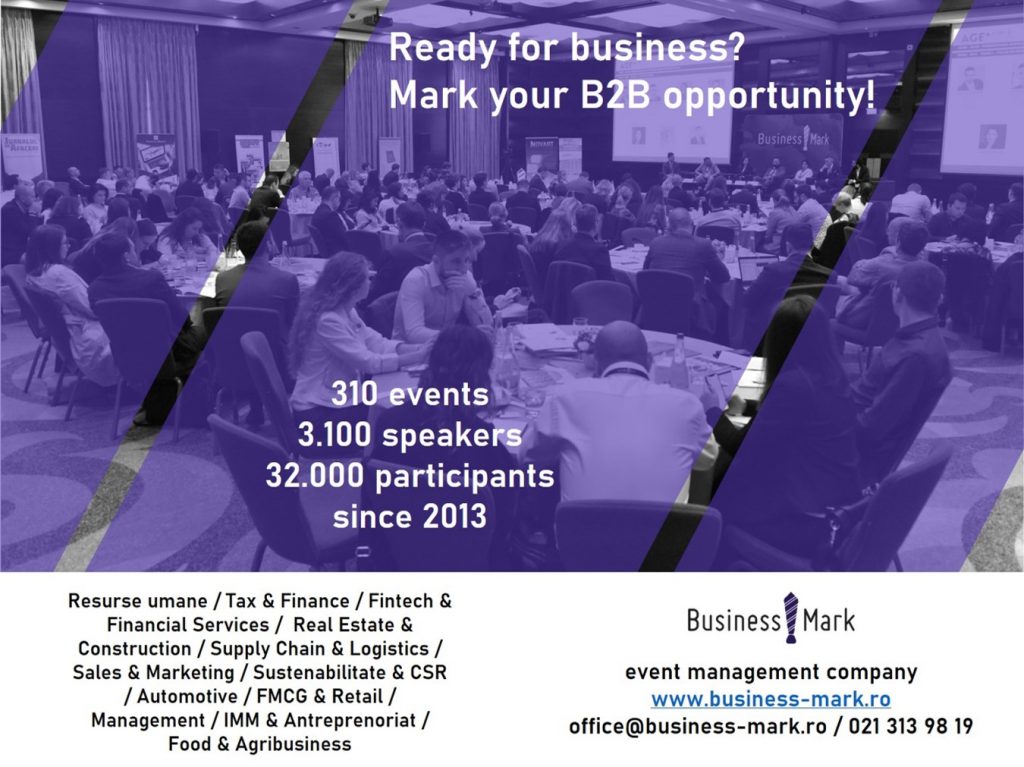 BusinessMark oferă și posibilitatea construirii de evenimente B2B pentru companii, evenimente gândite și planificate împreună cu fiecare client astfel încât să respecte linia de comunicare și strategia de business ale companiei.