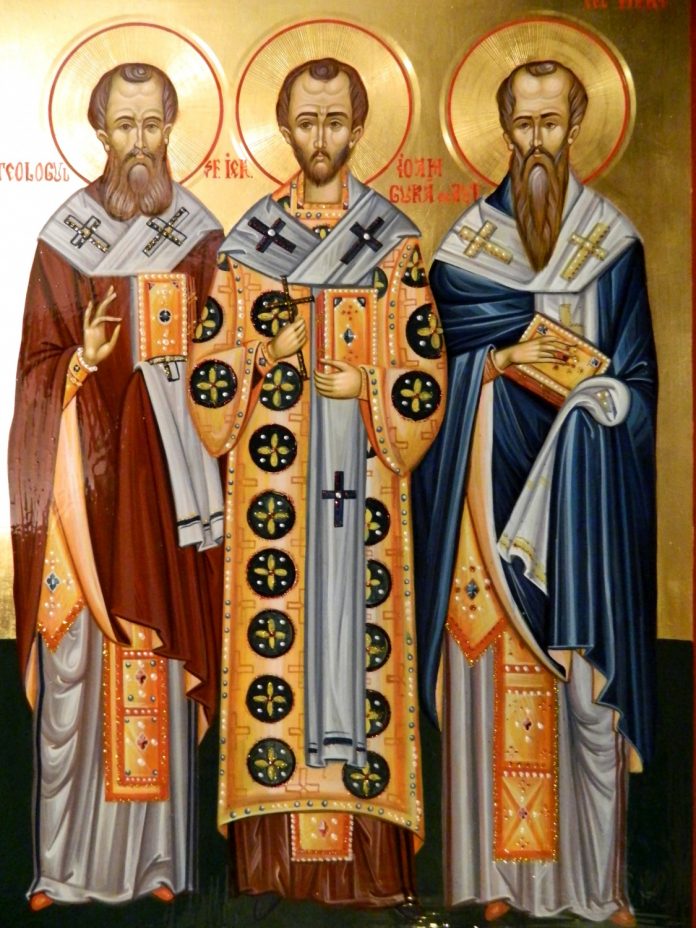 Joi, 30 ianuarie a.c., îi prăznuim pe Sfinţii Vasile cel Mare, Grigorie Teologul şi Ioan Gură de Aur. Pentru că sunt prăznuiţi împreună, sărbătoarea poartă numele de Sfinţii Trei Ierarhi.
