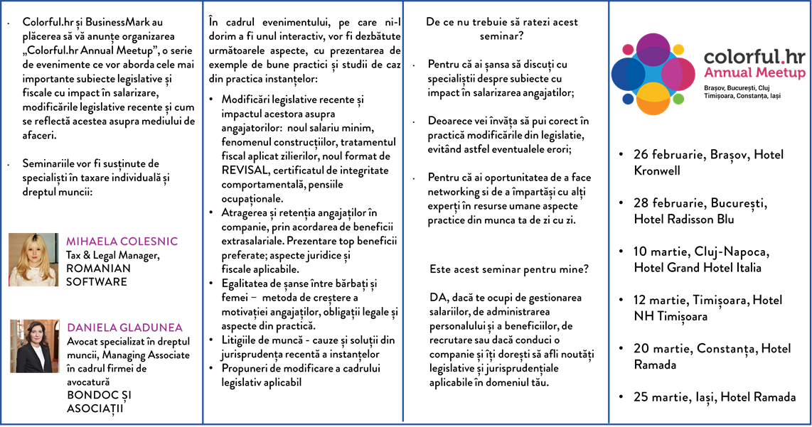 Colorful.hr și BusinessMark lansează „Colorful.hr Annual Meetup”, eveniment ce va avea loc în principalele orașe ale României și în cadrul căruia se va discuta despre cele mai importante subiecte cu impact în salarizare.
