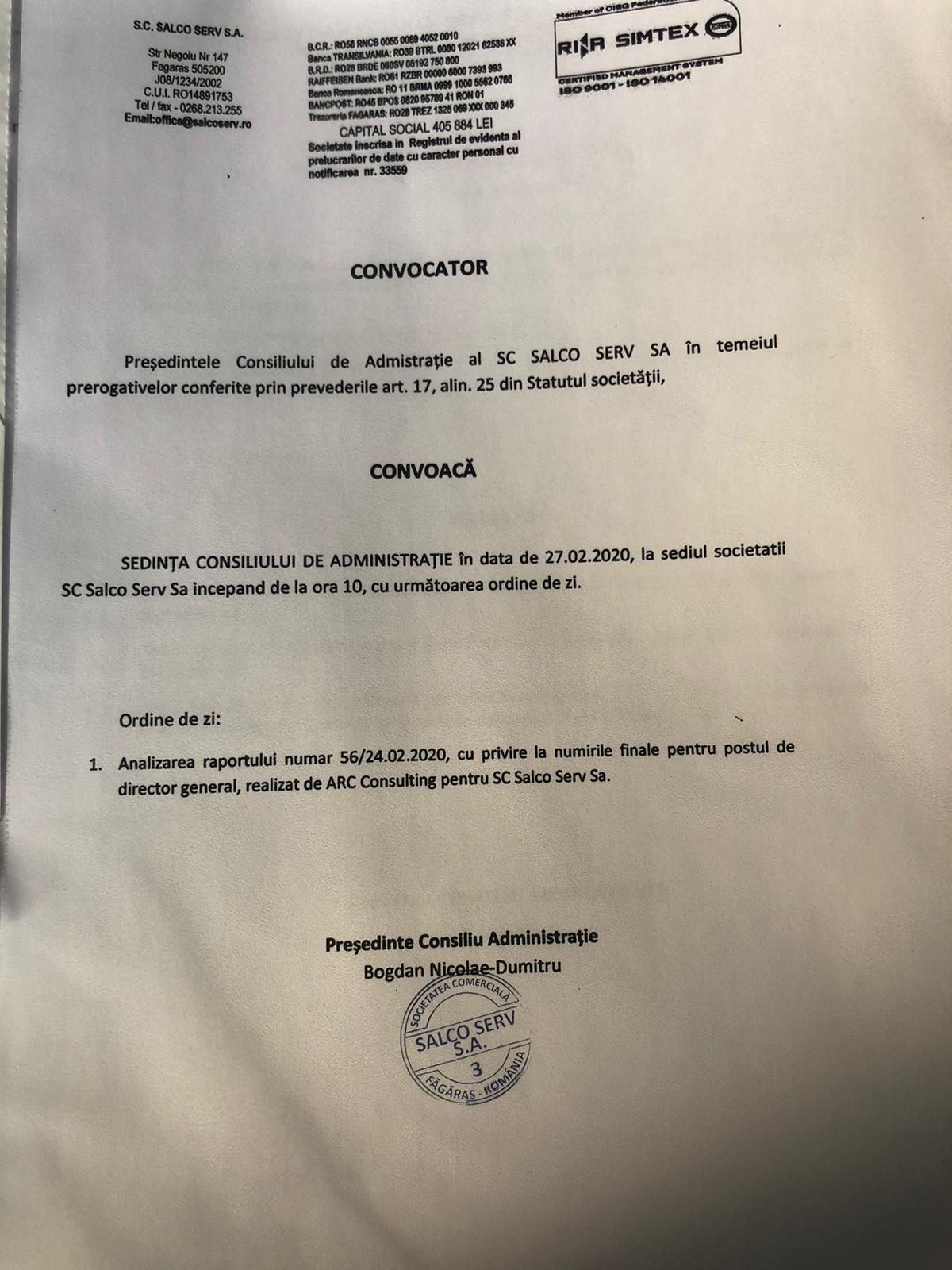 Salco Serv SA, societatea cu unic acţionar Consiliul Local Făgăraş, care se ocupă de activitatea de salubrizare a municipiului Făgăraş, a convocat consiliul de administraţie în şedinţă joi, 27 februarie a.c., începând cu ora 10.00. Membrii CA vor stabili persoana care va ocupa funcţia de director general începând cu data de 1 martie 2020, când se va încheia interimatul pentru această funcţie. ,,Analiza raportului nr. 56/24.02.2020, cu privire la numirile finale pentru postul de director general, realizat de ARC Consulting pentru Salco Serv SA” este convocatorul şedinţei semnat de preşedintele CA de la Salco Serv SA, Bogdan Nicolae Dumitru.
