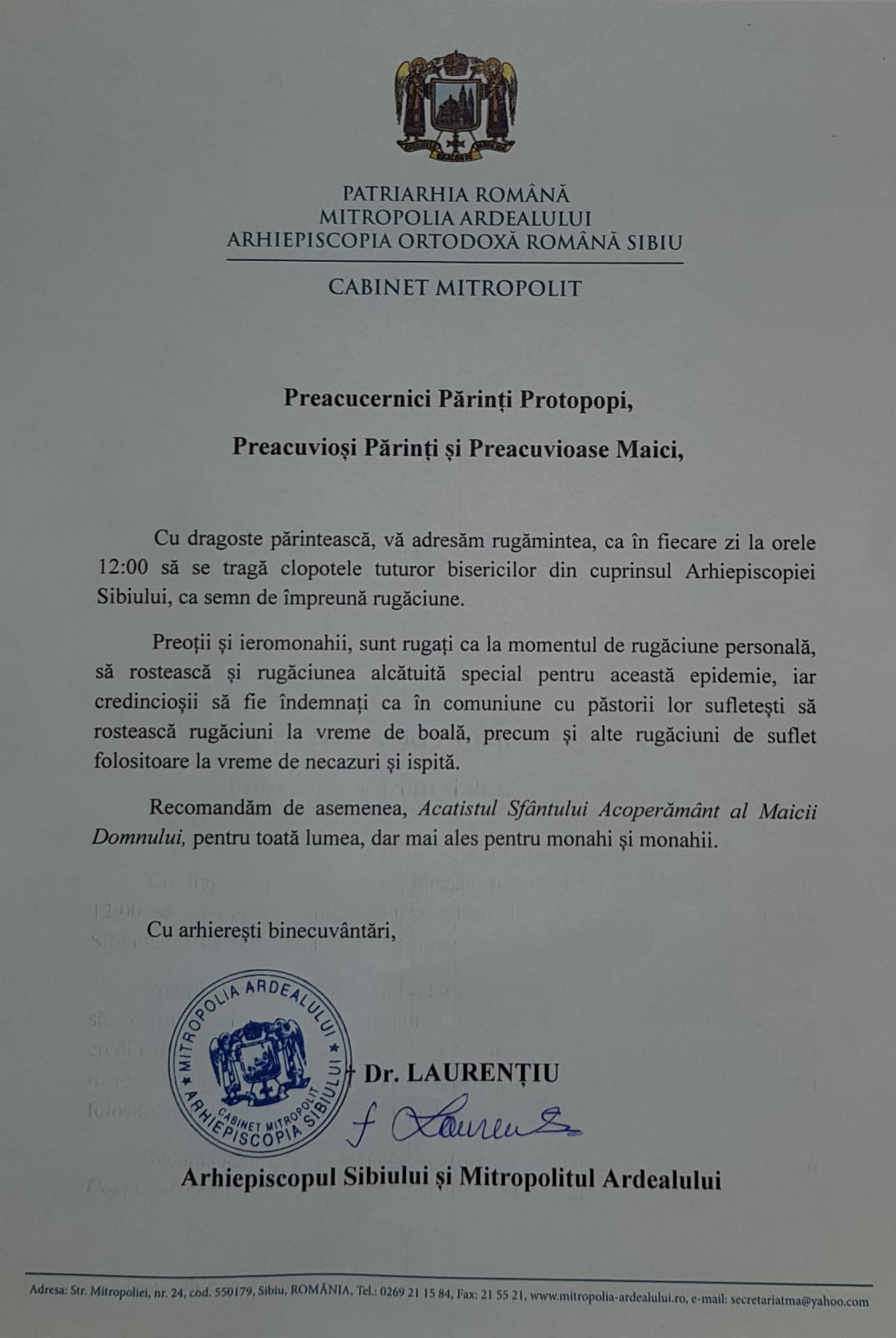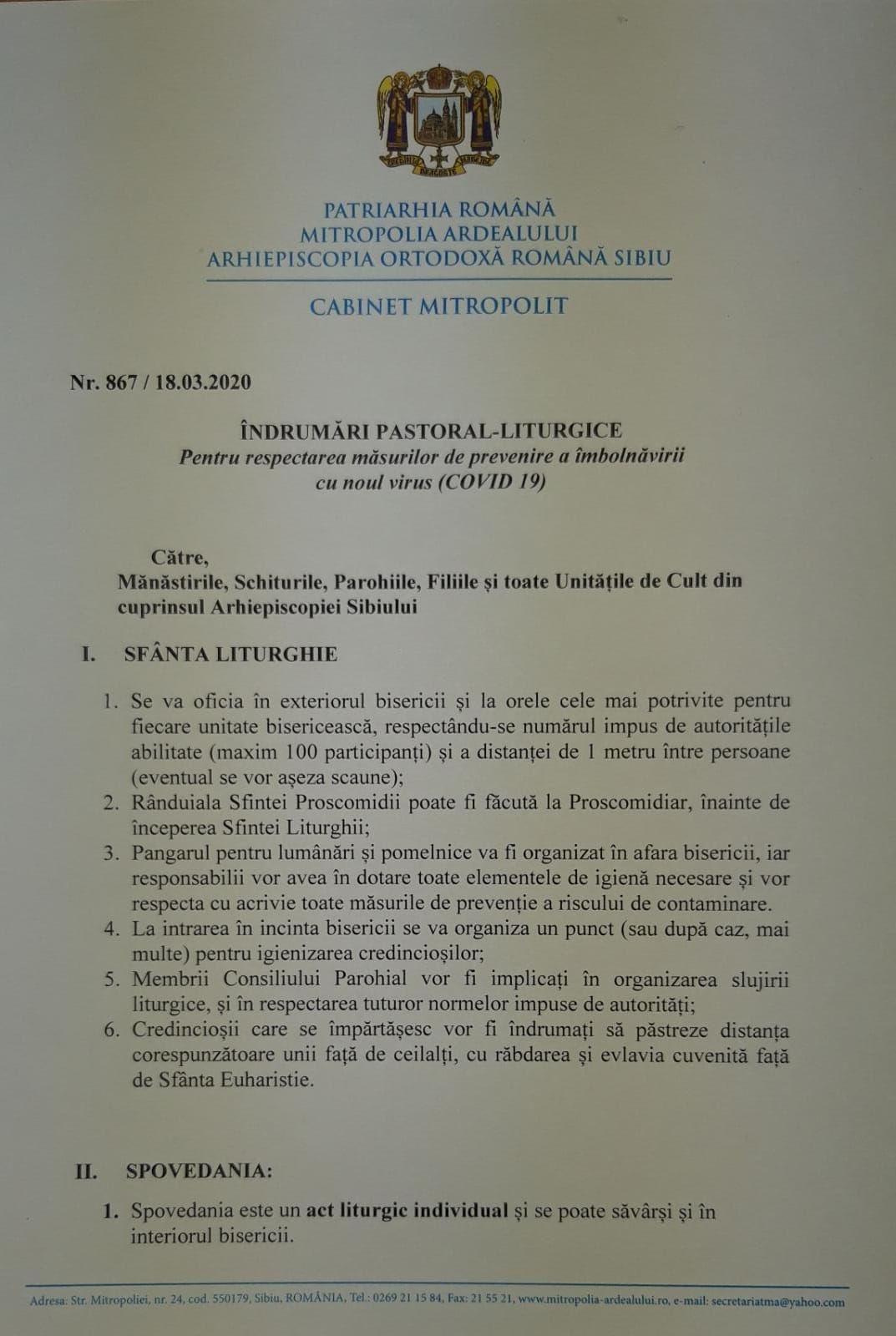 În cadrul Centrului Eparhial Sibiu a fost constituită o celulă de criză formată din IPS Mitropolit dr. Laurențiu Streza, Arhimandrit Ioachim Tomoioagă-Vicar Eparhial, Pr. Cristian Vaida-Secretar eparhial. Recomandările Patriarhiei au fost deja transmise în teritoriul prin intermediul mitropoliilor, episcopiilor, protopopiatelor și preoților parohi.