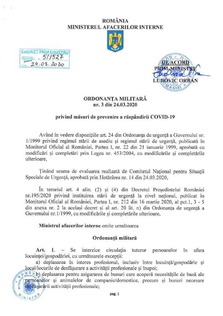 „Având în vedere dispoziţiile art. 24 din Ordonanţa de urgenţă a Guvernului nr. 1/1999 privind regimul stării de asediu şi regimul stării de urgenţă, publicată în Monitorul Oficial al României, Partea I, nr. 22 din 21 ianuarie 1999, aprobată cu modificări şi completări prin Legea nr. 453/2004, cu modificările şi completările ulterioare, ţinând seama de evaluarea realizată de Comitetul Naţional pentru Situaţii Speciale de Urgenţă, aprobată prin Hotărârea nr. 14 din 24.03.2020, în temeiul art. 4 alin. (2) şi (4) din Decretul Preşedintelui României nr.195/2020 privind instituirea stării de urgenţă la nivel naţional, publicat în Monitorul Oficial al României, Partea I, nr. 212 din 16 martie 2020, al pct.1, 3 – 5 din anexa nr. 2 la acelaşi decret şi al art. 20 lit. n) din Ordonanţa de urgenţă a Guvernului nr.1/1999, cu modificările şi completările ulterioare, Ministrul afacerilor interne emite următoarea Ordonanţă militară: