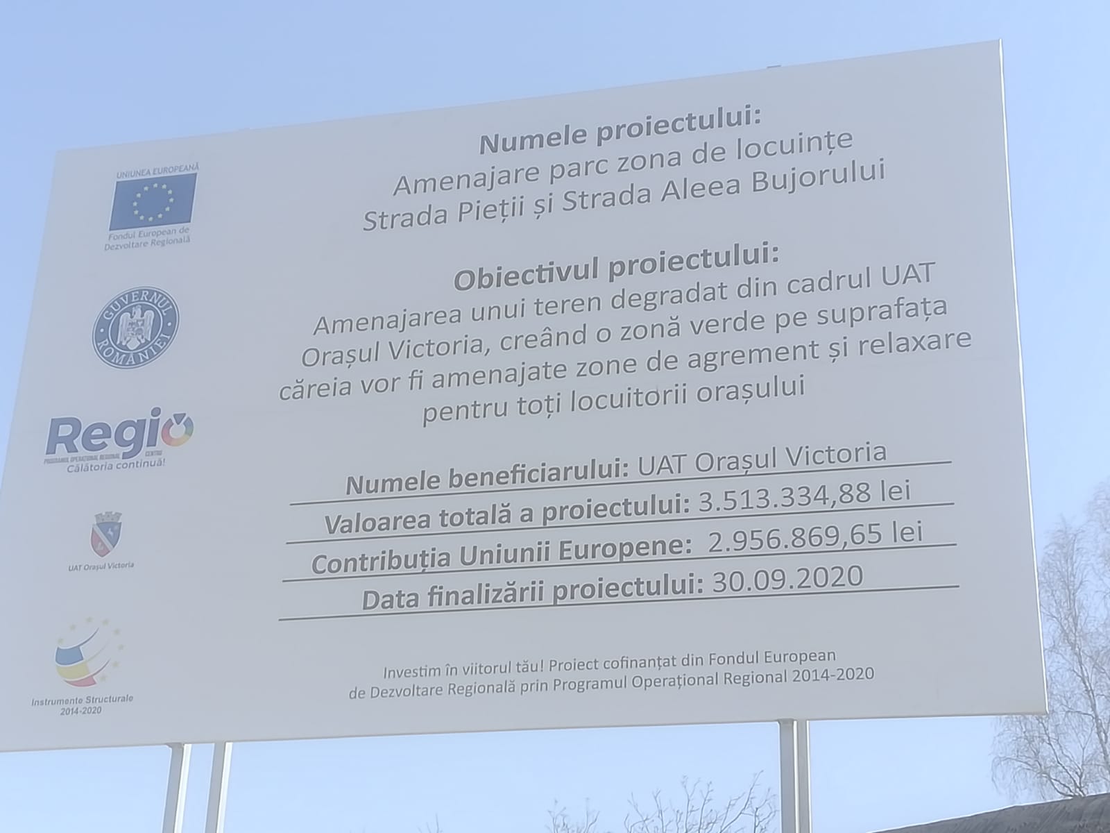 • Terenul degradat din zona Pieţii din Victoria, unde până mai ieri erau grădinile şi garajele localnicilor, va fi transformat într-un parc de agrement printr-un proiect al Primăriei Victoria denumit  ,,Amenajare parc zona de locuinţe strada Pieţii şi strada Aleea Bujorului’’. ,,Proiectul este finanţat din fonduri europene şi prevede transformarea terenului, care acum este degradat, într-o zonă verde  pe suprafaţa căreia vor fi amenajate spaţii de agrement şi  de relaxare pentru toţi locuitorii oraşului” a spus primarul Gheorghe Cristian.