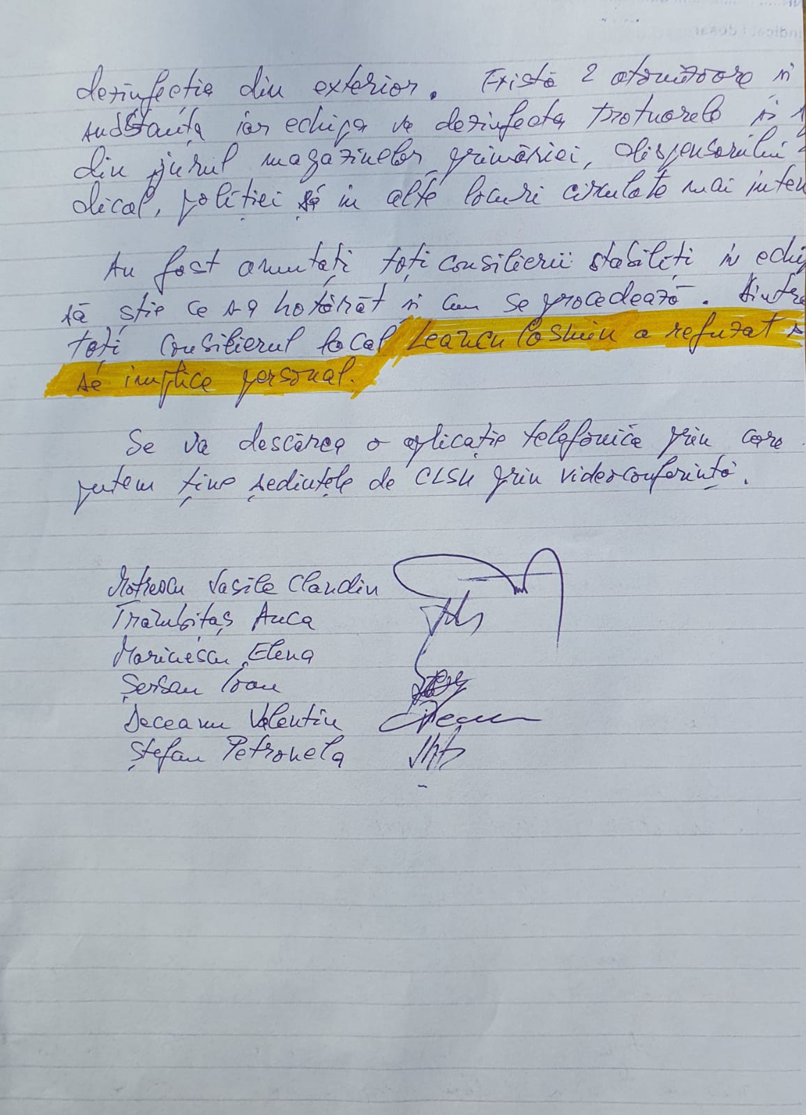 O echipă formată din angajaţi ai primăriei va urmări serviciile de dezinfecţie a trotuarelor, a spaţiilor din jurul magazinelor, primăriei, dispensarului, poliţiei şi alte locuri circulate mai intens. Conform aceluiaşi proces verbal, consilierul local Cosmin Leancu a refuzat să se implice personal.