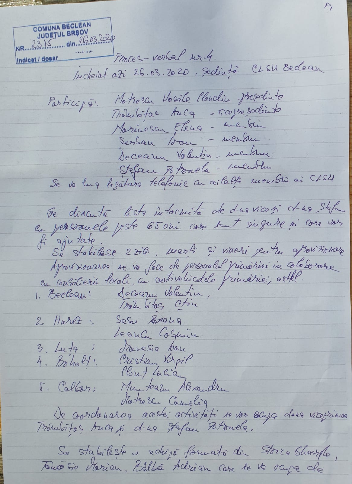 Vârstnicii de peste 65 de ani din comuna Beclean vor fi sprijiniţi pe perioada stării de urgenţă prin decizia Comitetul Local pentru Situaţii de Urgenţă Beclean luată în şedinţa care a avut loc în ziua de 26 martie a.c. A fost stabiltă şi lista persoanelor vârstnice care intră sub incidemţa prevederilor stipulate în procesul verbal al CLSU Beclean întocmit în 26 martie. CLSU Beclean a stabilit 2 zile pe săptămână, marţi şi vineri, în care se va face aprovizionarea acestei categorii de localnici din fiecare sat al comunei de către personalul angajat al Primăriei Beclean în colaborare cu consilierii locali. Coordonarea acestei activităţi va fi realizată de viceprimarul Anca Trâmbiţaş şi Ştefan Petronela.