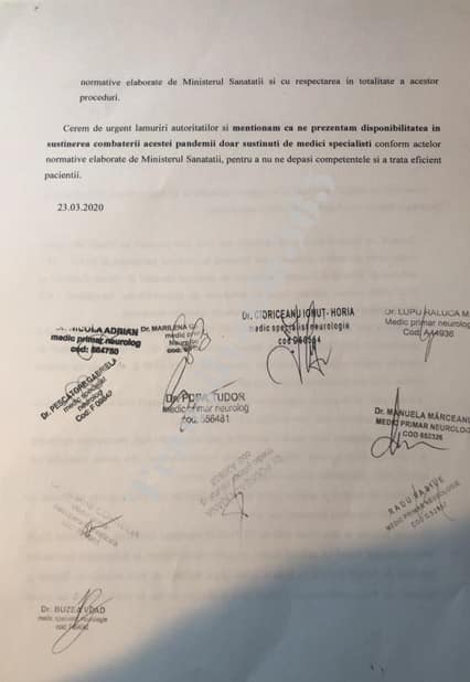 Consider că modul de acțiune al managerului de a pune spitalul în fața faptului împlinit, are dublă consecință negativă. Pe de o parte, starea de sănătate a întregului personal al SCPN Brașov este periclitată, iar pe de altă parte, urmare a faptului că personalul medical nu are competențe ATI, infecțioase, pneumologie și nu dispune de medici din aceste specialități medicale, consider că șansele de supraviețuire a potențialilor pacienți COVID-19, sunt reduse”.