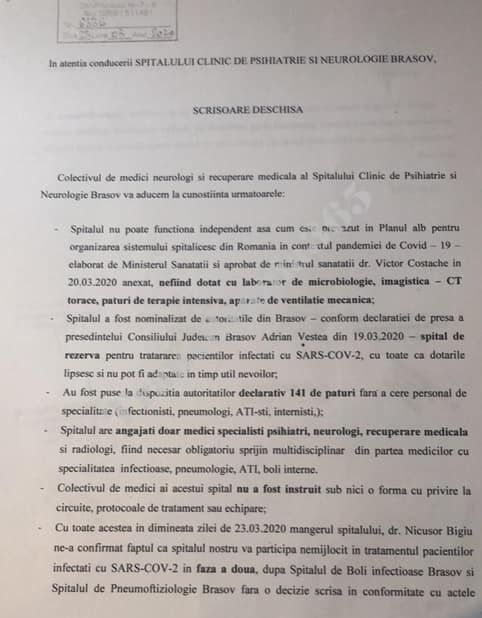 Consider că modul de acțiune al managerului de a pune spitalul în fața faptului împlinit, are dublă consecință negativă. Pe de o parte, starea de sănătate a întregului personal al SCPN Brașov este periclitată, iar pe de altă parte, urmare a faptului că personalul medical nu are competențe ATI, infecțioase, pneumologie și nu dispune de medici din aceste specialități medicale, consider că șansele de supraviețuire a potențialilor pacienți COVID-19, sunt reduse”.