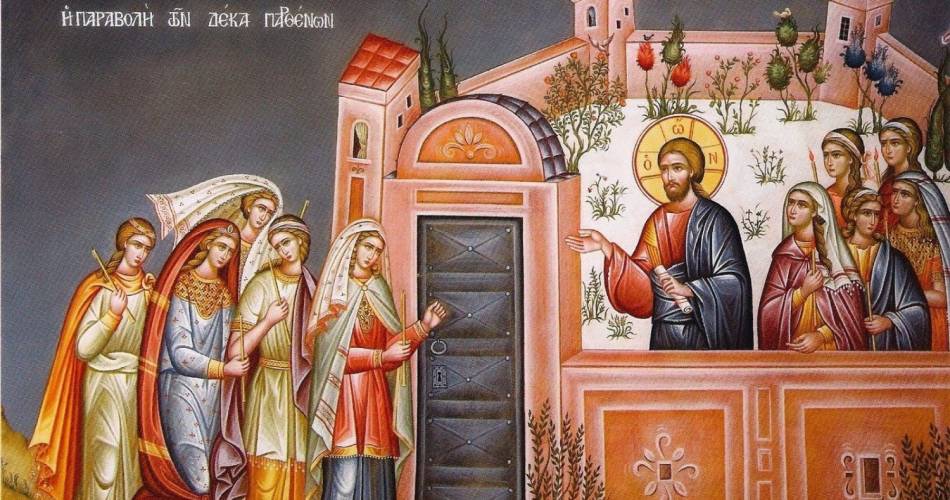,,Împărăția cerurilor se va asemăna cu zece fecioare care, luând candelele lor, au ieșit în întâmpinarea mirelui. Cinci însă dintre ele erau fără minte, iar cinci înțelepte. Căci cele fără minte, luând candelele, n-au luat cu sine untdelemn, iar cele înțelepte au luat untdelemn în vase, o dată cu candelele lor. Dar mirele întârziind, au ațipit toate și au adormit. Iar la miezul nopții s-a făcut strigare: Iată, mirele vine! Ieșiți întru întâmpinarea lui! Atunci s-au deșteptat toate acele fecioare și au împodobit candelele lor. Și cele fără minte au zis către cele înțelepte: Dați-ne din untdelemnul vostru, că se sting candelele noastre. Dar cele înțelepte le-au răspuns, zicând: Nu, ca nu cumva să nu ne ajungă nici nouă și nici vouă. Mai bine mergeți la cei ce vând și cumpărați pentru voi. Deci plecând ele ca să cumpere, a venit mirele, și cele ce erau gata au intrat cu el la nuntă și ușa s-a închis. Iar mai pe urmă au sosit și celelalte fecioare, zicând: Doamne, Doamne, deschide-ne nouă. Iar el, răspunzând, a zis: Adevărat zic vouă: Nu vă cunosc pe voi. Drept aceea, privegheați, că nu știți ziua, nici ceasul când vine Fiul Omului”. (Matei 25, 1-13)