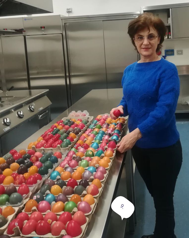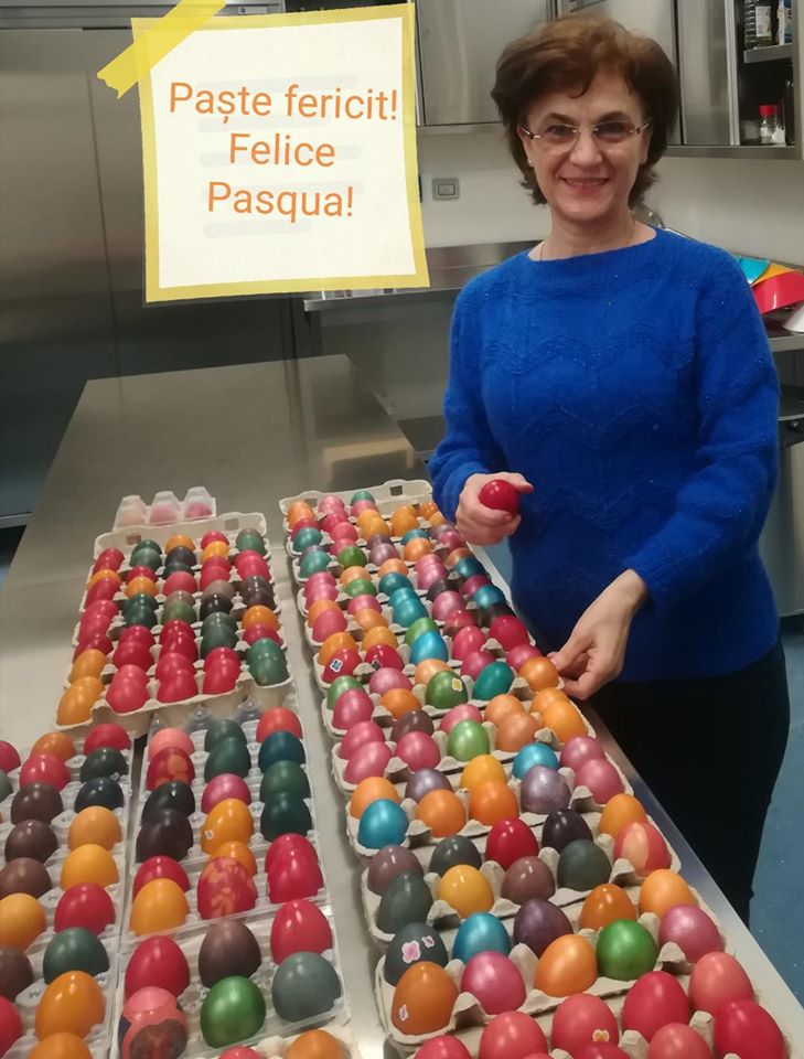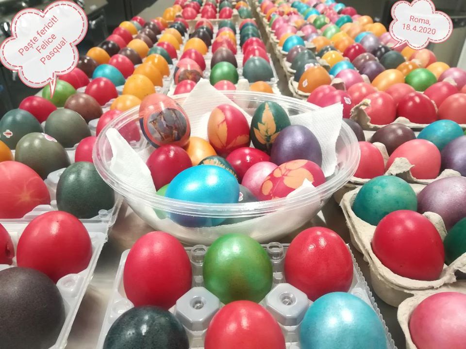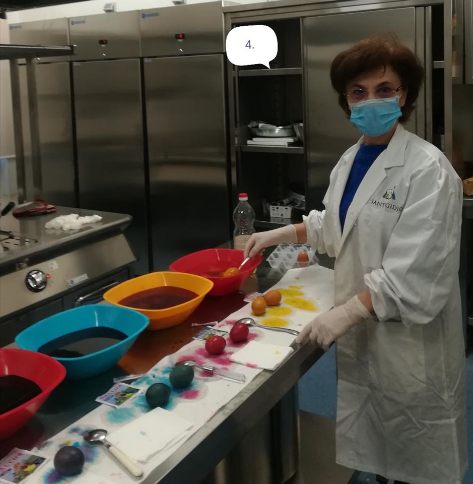 • ,,Am mers la Sant’Egidio de Paştele ortodox, am vopsit 300 de ouă cu galus românesc pentru a le împărţi celor care au nevoie de hrană şi mângâiere. Cei care au intrat pe poarta fundaţiei au fost întâmpinaţi cu salutul sărbătorii ,,Hristos a Înviat” şi au primit câte o lumânare aprinsă şi câte o icoană. Apoi i-am servit cu ouă vopsite aşa cum impune tradiţia şi un prânz de Paşte. Nu vă pot descrie ce sentimente m-au încercat în această zi în preajma acestor oameni. Privirea din ochii lor a spus totul. M-au ajutat în acest an să pregătesc ouăle penru Paştile ortodoxe Mădălina (România), Carla (Italia) şi Anoir (Maroc),  cărora le mulţumesc” a explicat profesoara Angela Nicoară. Întrebată dacă nu-i este teamă că se infectează, răspunsul a fost simplu: ,,Nu. Purtăm toţi mănuşi şi mască de protecţie. Dacă am avea teamă de coronavirus n-am mai fi aici să ajutăm”.