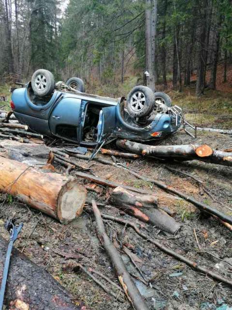 Maşină răsturnată pe drumul dintre Poiana Mărului şi Zărneşti