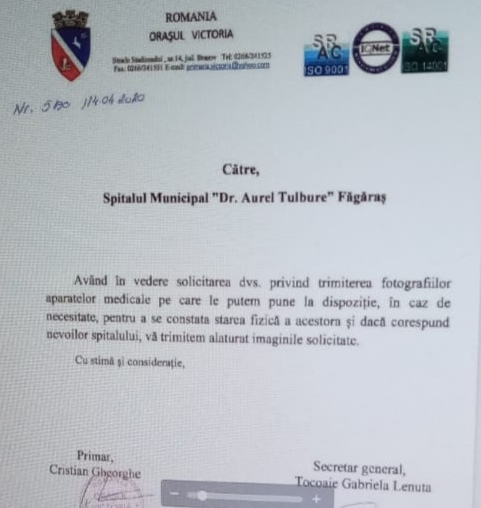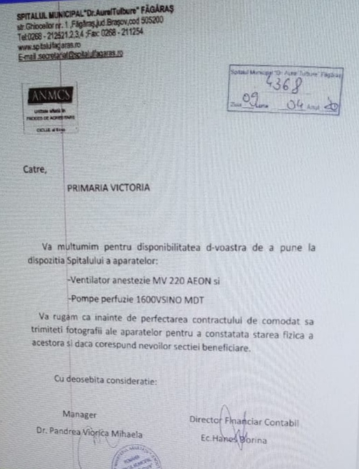 Primăria Victoria şi Clinica Paltinul Victoria vor pune la dispoziţia Spitalului Muncipal Făgăraş aparatură medicală de ultimă generaţie necesară pacienţilor infestaţi cu coronavirus ajunşi la ATI. ,,În caz de necesitate vom pune la dispoziţia Spitalului Municipal Făgăraş aparatură medicală pentru pacienţii testaţi pozitiv COVID – 19. Este vorba despre un ventilator anestezie şi pompe pentru perfuzii. Managerul Spitalului Municipal Făgăraş ne-a solicitat fotografii cu aparatura medicală pentru a constata starea acestora şi dacă corespund nevoilor secţiei beneficiare. Aparatele medicale sunt noi, iar valoarea acestora este de peste 20.000 euro’’ a spus Gheorghe Cristian, primarul oraşului Victoria.