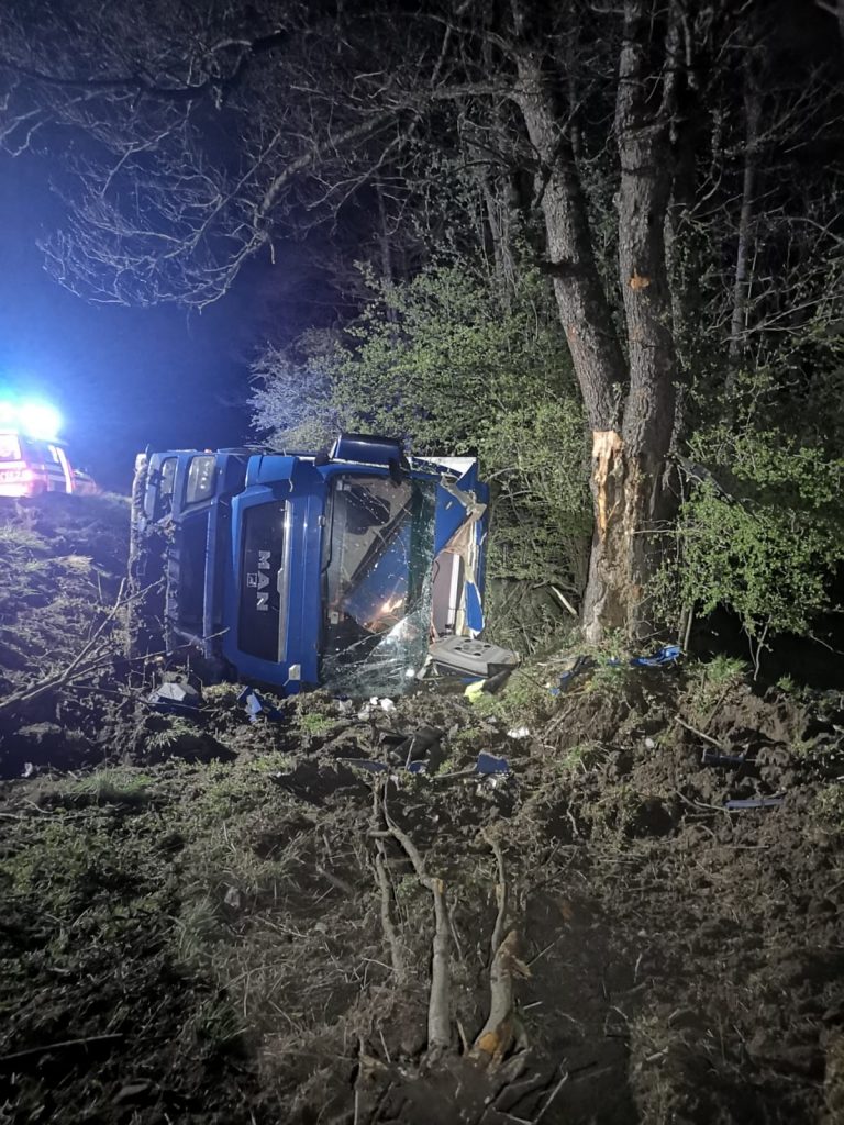 Un tir încărcat cu produse alimentare s-a răsturnat pe DN13, în Pădurea Bogăţii, în noaptea de 30 aprilie/1 mai, în jurul orei 24.00. La faţa locului s-au deplasat un echipaj SMURD şi o autospecială cu apă şi spumă. Victimă a fost şoferul tir-ului, un bărbat de 25 de ani, care însă a refuzat transportul la spital. În aceeaşi seară, un camion de 7,5 tone s-a răsturnat peste separatoarele de sens, tot pe DN 13, în localitatea Fişer din comuna Buneşti. Camionul prezenta scurgeri de combustibil, şoferul reuşind să iasă din autovehicul. S-au deplasat la faţa locului un echipaj SMURD şi unul cu apă şi spumă. Şoferul a refuzat transportul la spital.