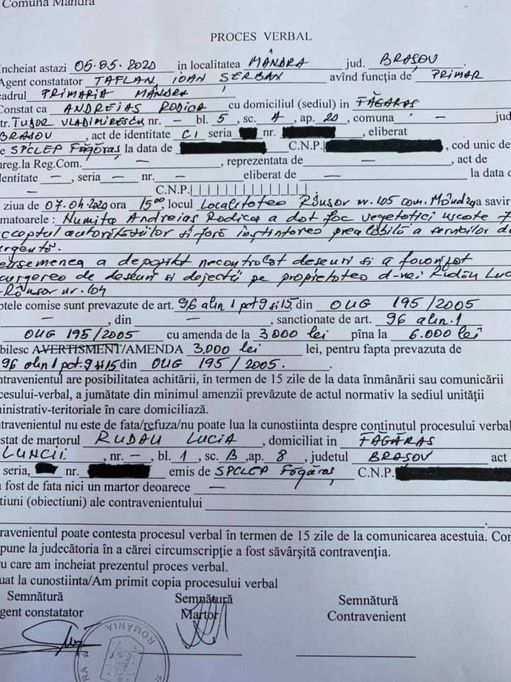 •   Şi Cucu Gheorghe din Mândra a fost sancţioat cu 2000 lei pentru că a pătruns cu tractorul pe drumul de exploataţie lăsând  noroi şi resturi vegetale pe asfalt şi a distrus rigola, se stipulează în  procesul verbal încheiat de Primăria Mândra în data de 8 mai 2020.