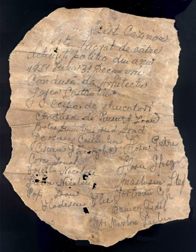 - ,,Acest Cazinou este lucrat de către deţinuţii politici din anul 1951 luna 31 Decembrie, condusă de arhitectul Joja Constantin. Echipa de stucatori condusă de Rusu A Ioan, Botoş Dumitru jud Arad, Jercău Constantin, Ciscău Gheorghe, Coraş Ionel, Sava Nicolae, Pop Ioan, Vlădescu Ilie, Hosu Petre, Hosu Ghegor, Anastasiu Ştefan, Gorbovan Gh., Bamer Fidel şi Morton Iuliu”, scrie pe bucata de hârtie, ruptă dintr-un sac de ciment.