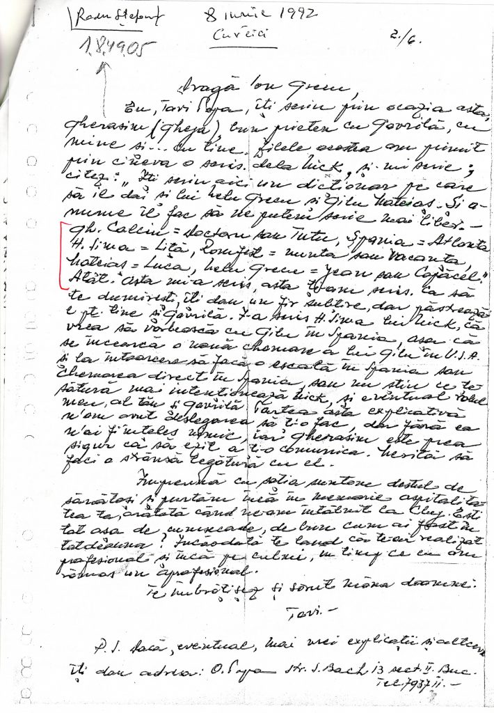 În scrisoarea datată 16 mai 1992, printre informaţii legate de editarea cărţilor lui Mateiaş ori despre ,,nunta din Canada” (festivalul Romfest, conform cifrului), o anume Jessy îi transmite lui Virgil Mateiaş, insistând chiar, că este mai important să se ducă în ,,Atlanta”, la “Liţă” (adică să meargă în Spania, la Horia Sima).   „În ceea ce priveşte nunta din Canada cum am scris mai sus, este mai importantă să se facă vizita în Atlanta la Liţă sau în Franţa sau Germania. Acolo unde este mai convenabil.” Cu doar o săptămână înainte, pe 9 mai 1992, lui Mateiaş îi fusese adusă încă odată la cunoştinţă stringenţa unei întâlniri cu Horia Sima: “Dacă Luca nu poate să meargă la nuntă ar fi bine cel puţin să meargă în Atlanta sau în altă parte, ca să stea de vorbă cu Liţă” (adică, dacă nu va ajunge la Romfest, în Canada, atunci să meargă în Spania pentru a-l întâlni pe Sima). În arhiva lui Virgil Mateiaş, mai există o scrisoare purtând, de asemenea cifrul corespondenţei, scris de această data de interlocutoarea “Jessy”, care plasează din nou, printre comunicări banale, mesajul: “Luca să caute să-l întâlnească pe Liţă în Atlanta sau în altă parte, cum vor aranja ei.”