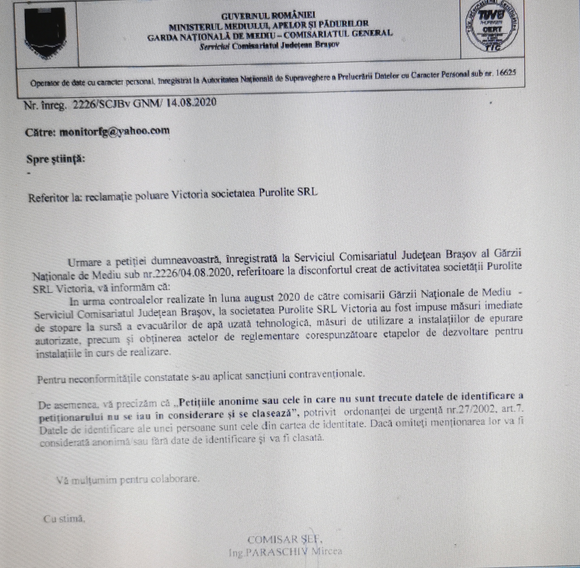 • ,,În urma controalelor realizate în luna august 2020 de către comisarii Gărzii Naţionale de Mediu, Serviciul Comisariatul Judeţean Braşov, la societatea Purolite SRL Victoria au fost impuse măsuri imediate de stopare  la sursă a evacuărilor de apă uzată tehnologică, măsuri de utilizare a instalaţiilor de epurare autorizate, precum şi obţinerea actelor de reglementare corespunzătoare etapelor de dezvoltare pentru instalaţiile în curs de realizare. Pentru neconformităţile constatate s-au aplicat sancţiuni contravenţionale” se arată în comunicatul Gărzii Naţionale de Mediu remis redacţiei Monitorul de Făgăraş, semnat de comisarul şef, Paraschiv Mircea. În comunicat nu se specifică şi cuantumul amenzii aplicate.